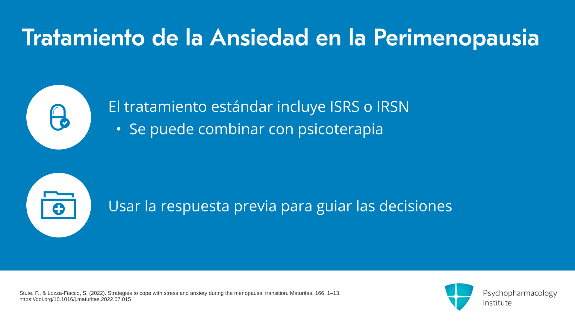 - Los ISRS e IRSN continúan siendo los tratamientos de primera línea para la ansiedad durante la perimenopausia, con o sin psicoterapia.