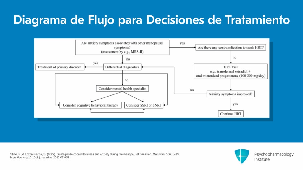 Este es un diagrama de flujo muy útil para decidir cómo tratar la ansiedad que surge durante la perimenopausia. La primera pregunta que deben hacerse es: ¿están los síntomas de ansiedad asociados con otros síntomas menopáusicos? Si lo están, necesitan saber si existen contraindicaciones para la terapia de reemplazo hormonal o terapia hormonal menopáusica. Si no las hay, pueden considerar un ensayo de terapia hormonal. Esto típicamente incluiría estradiol transdérmico y progesterona micronizada oral. Utilizamos progesterona micronizada oral porque se metaboliza en alopregnanolona, a diferencia de una progesterona sintética que no se metaboliza en alopregnanolona.