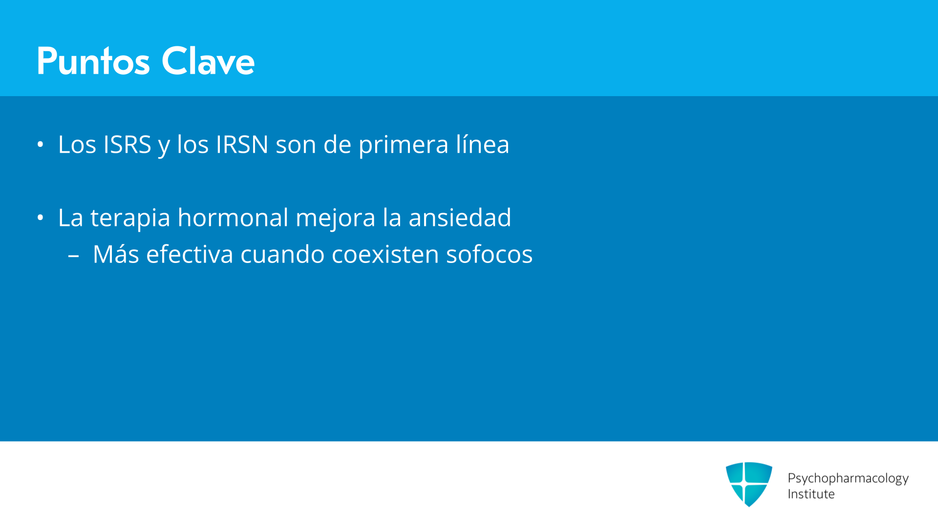 - Considere la terapia hormonal cuando los síntomas de ansiedad coinciden con otros síntomas menopáusicos y no existan contraindicaciones.