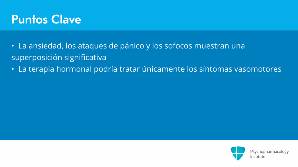 Sabemos que existen muchos trastornos de salud mental diferentes que pueden causar ansiedad en la perimenopausia. Deberían considerar el trastorno de ansiedad generalizada, trastorno de pánico, trastorno obsesivo-compulsivo u otros diagnósticos. Con el trastorno de pánico hay una superposición significativa entre los ataques de pánico y los sofocos. Dependiendo de lo que indique el diagnóstico diferencial, querrían tratar el trastorno primario si existe uno.