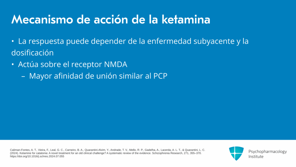 Ellos creen que la respuesta de la catatonía a la ketamina puede depender de la enfermedad psiquiátrica subyacente, y también puede depender de la dosis de ketamina. Señalaron que la ketamina actúa en el mismo sitio del receptor NMDA, el canal abierto, que la memantina y la amantadina, pero con una afinidad de unión mucho mayor. Y en ese sentido, es realmente similar al PCP, que también actúa en el canal abierto con mayor afinidad. Y sabemos por la literatura más antigua que el PCP, al igual que la ketamina, también puede inducir o empeorar la catatonía.