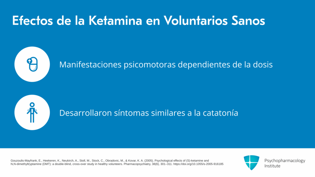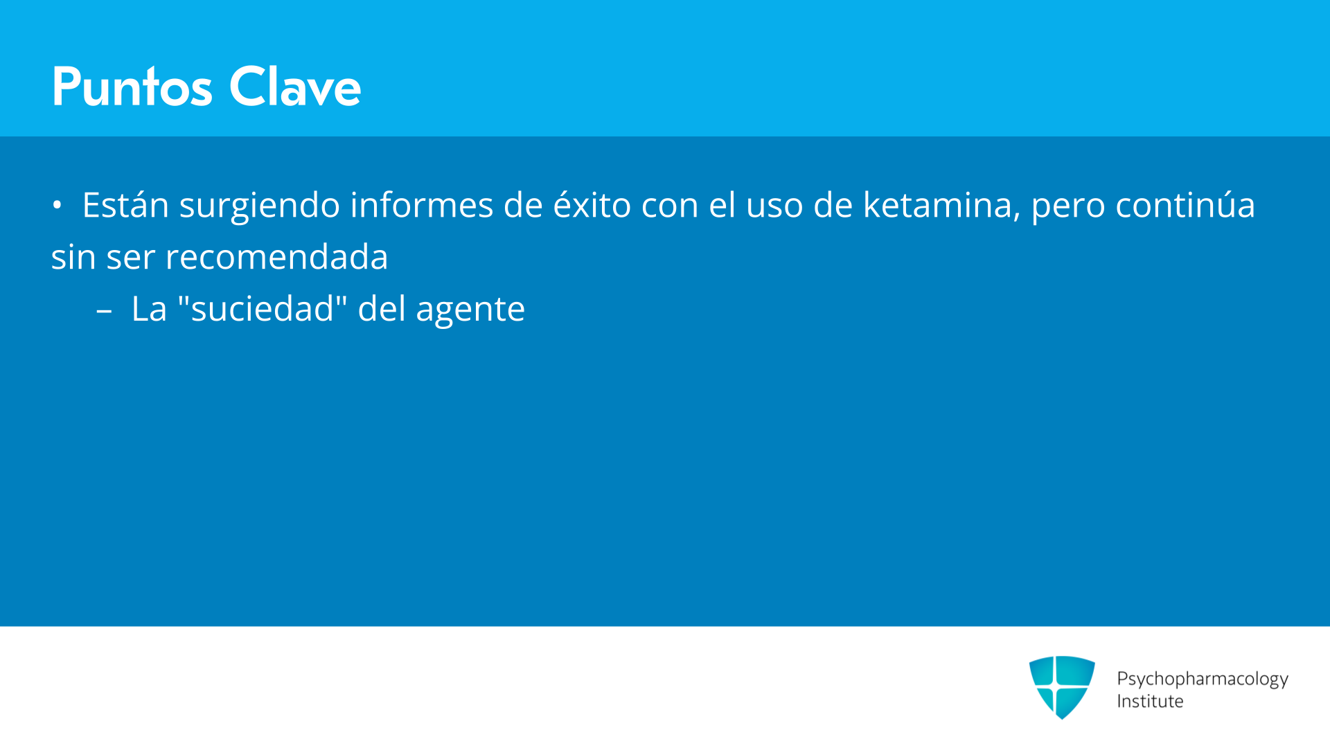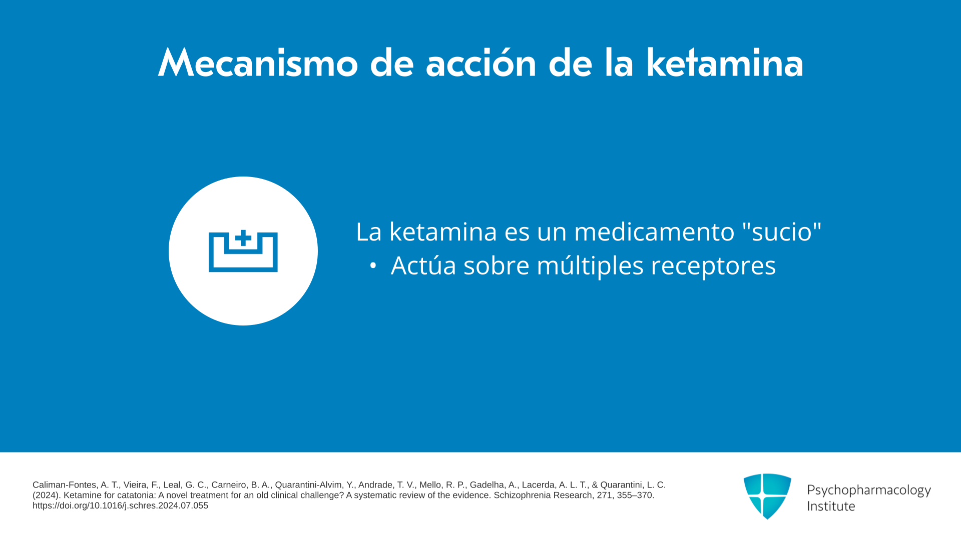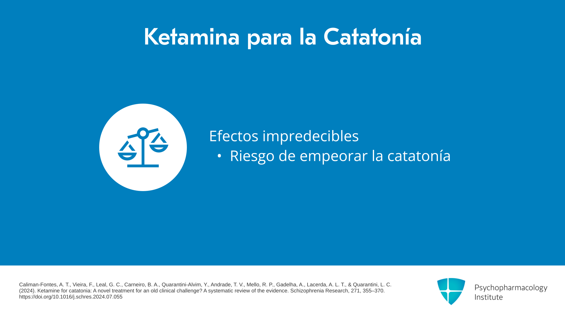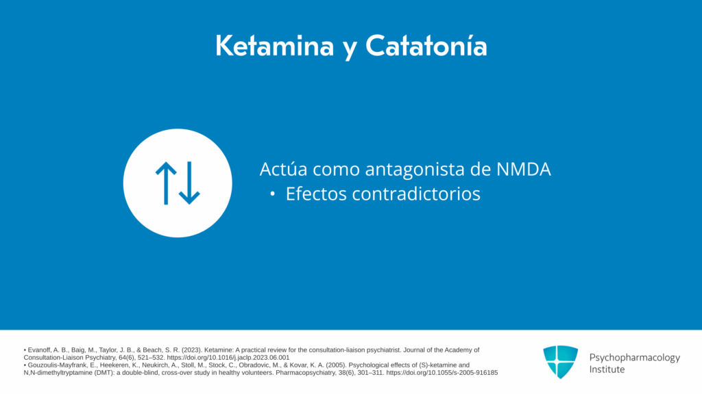 Otro agente que ha generado cierto interés con respecto a la catatonía y que también es un antagonista de NMDA es la ketamina. La ketamina es realmente interesante porque se ha asociado con la resolución de la catatonía en algunos informes, pero también se ha asociado con la inducción o el empeoramiento de la catatonía en otros informes.