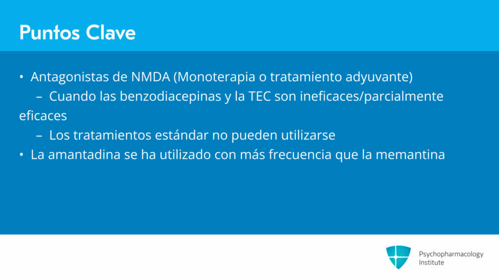 Para resumir, algunos puntos clave de esta sección: los antagonistas de NMDA deben considerarse ya sea como monoterapia o como potenciadores cuando las benzodiacepinas y la TEC son ineficaces, parcialmente eficaces o no se pueden utilizar. La amantadina se ha utilizado más comúnmente que la memantina en la literatura de casos clínicos, aunque ambas se han utilizado en docenas de casos hasta este momento.