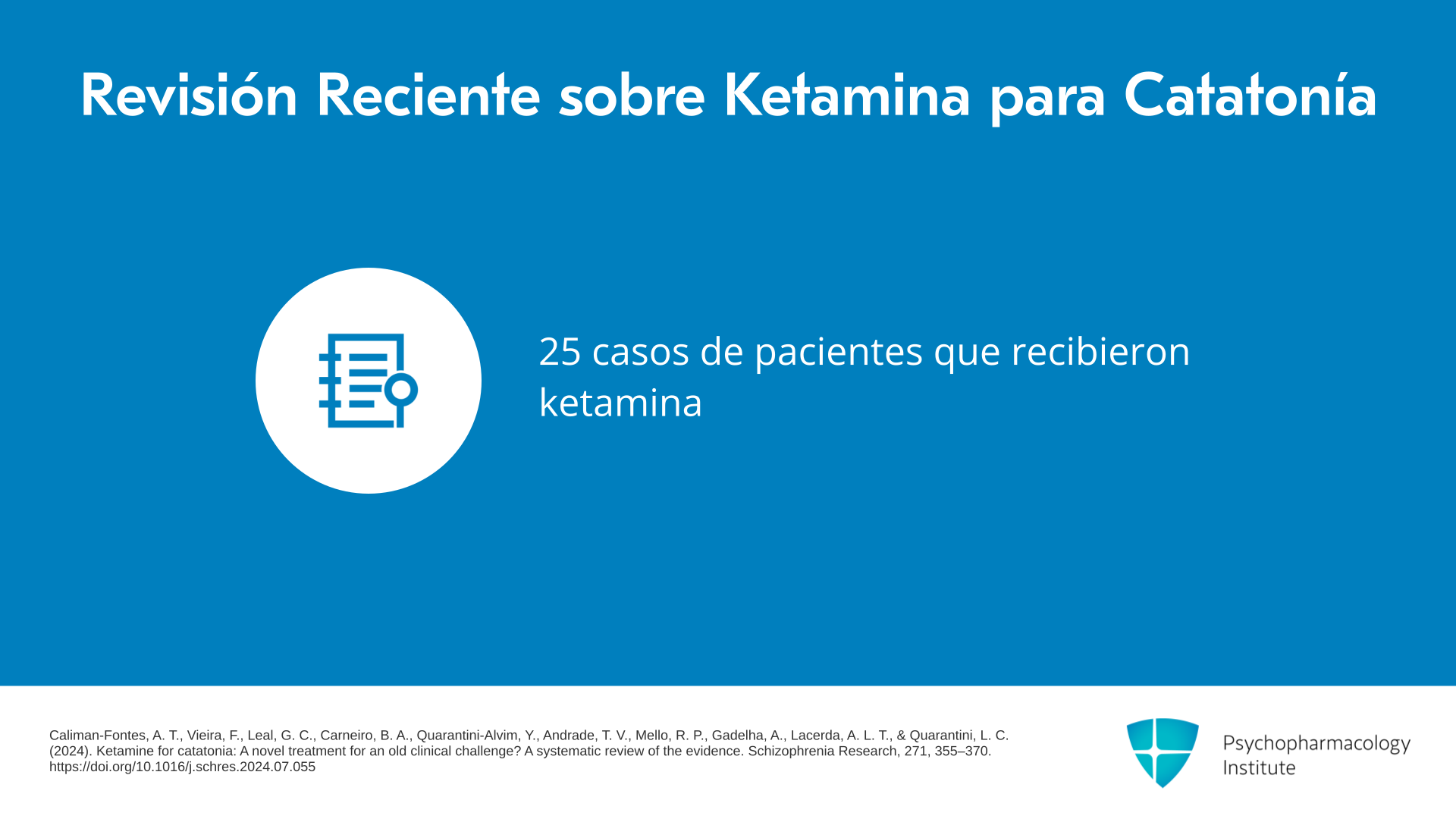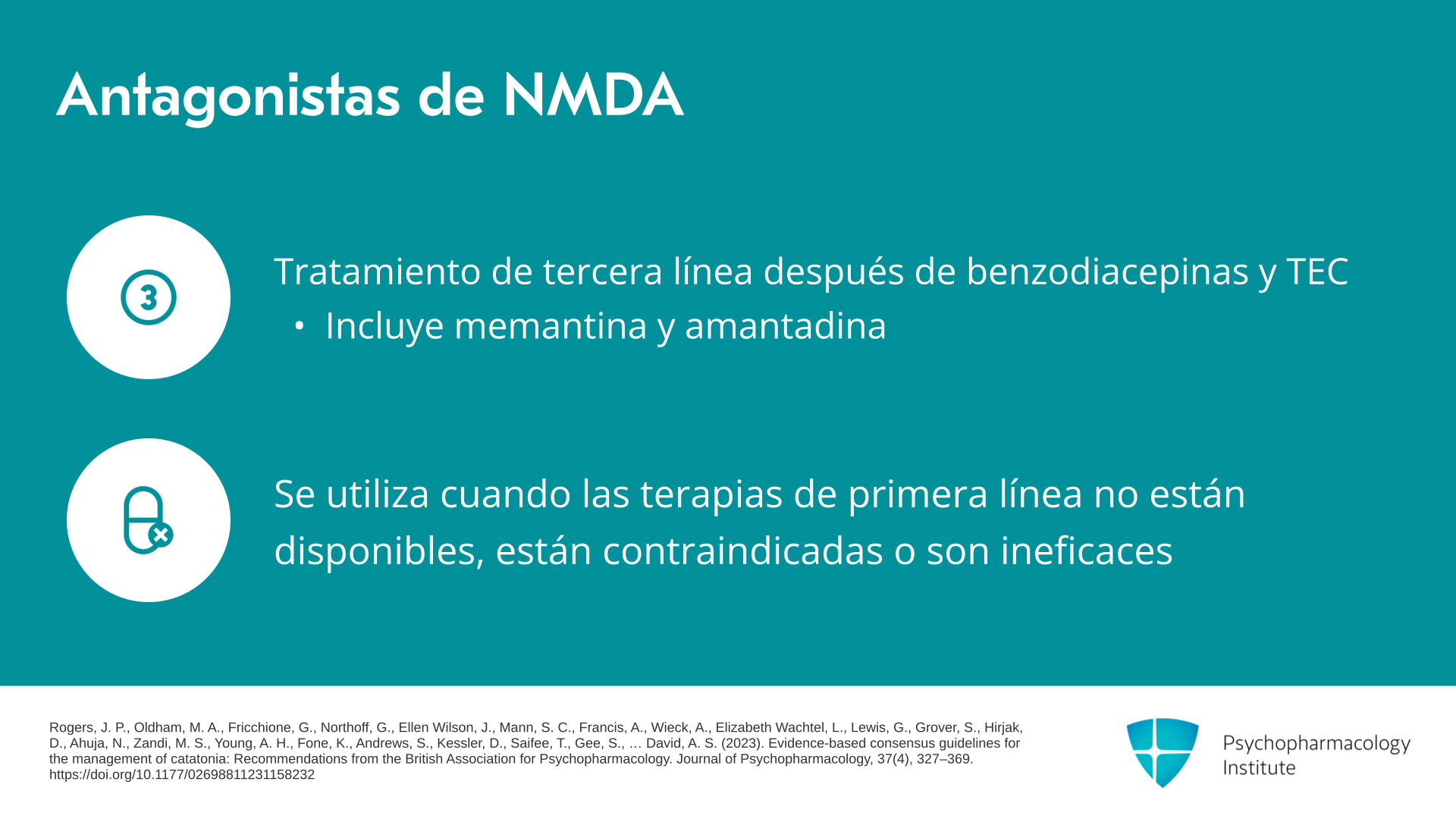 Además de las guías británicas, también contamos con una revisión de 2024 sobre el uso de antagonistas de NMDA para orientarnos. En esa revisión, la amantadina se había utilizado en al menos 27 casos de catatonía, y la memantina en al menos 20 casos. Por lo tanto, estamos obteniendo datos más sólidos sobre el uso de estos medicamentos. La mayoría de los casos tenían esquizofrenia como diagnóstico subyacente, y en algunos casos se logró una resolución rápida con antagonistas de NMDA.