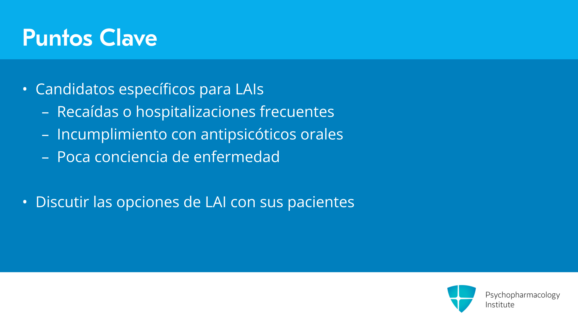 Los candidatos específicos para LAI incluyen pacientes con recaídas o hospitalizaciones frecuentes, pacientes que no cumplen con los antipsicóticos orales y aquellos con poca conciencia de enfermedad, pero también aquellos que prefieren el tratamiento con LAI. En definitiva, los clínicos deberían discutir los LAI como opción de tratamiento con sus pacientes.