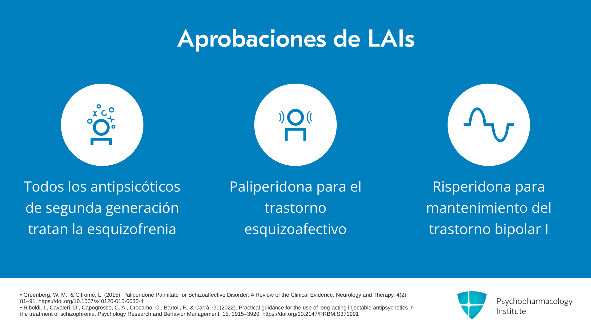 - Todos los antipsicóticos LAI de segunda generación están aprobados para el tratamiento de la esquizofrenia, y algunos cuentan con aprobación específica para el trastorno esquizoafectivo y el trastorno bipolar.