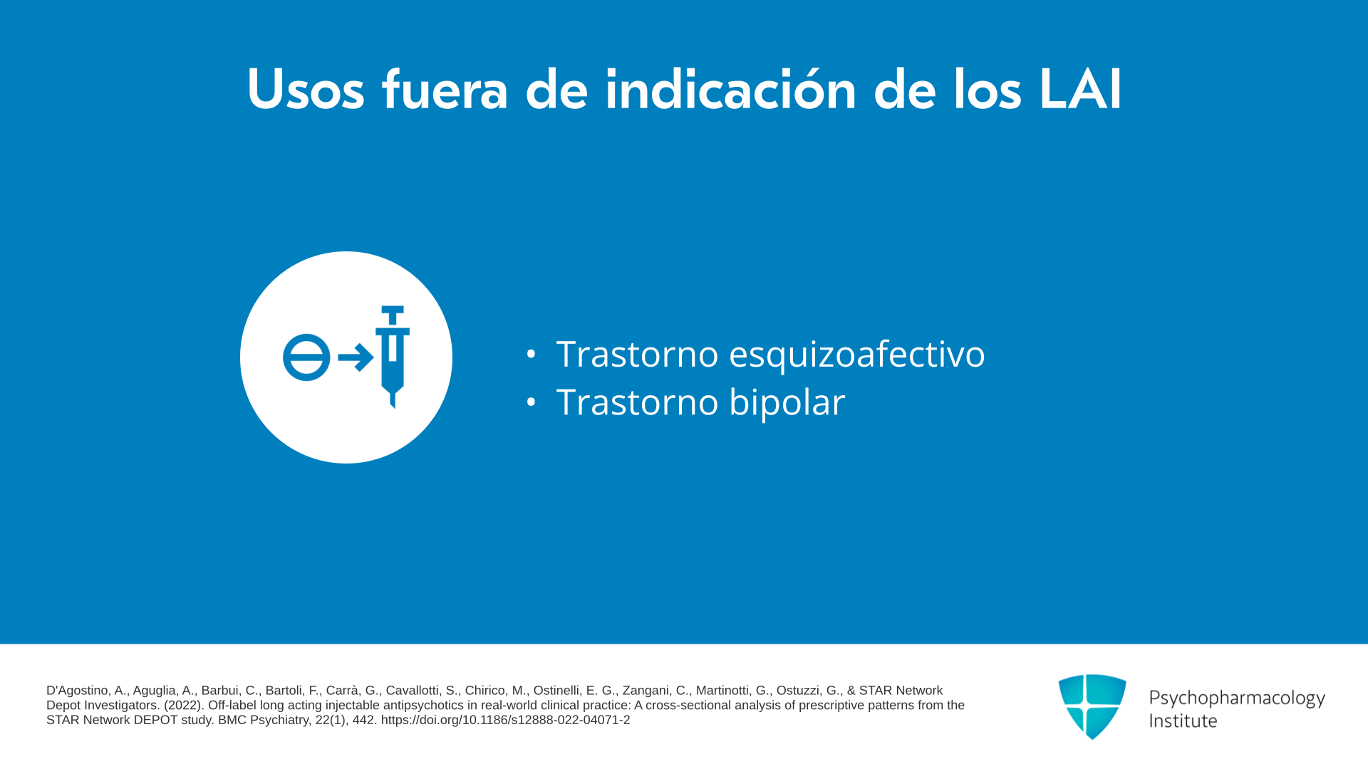 Dicho esto, los LAI se utilizan frecuentemente fuera de indicación tanto para pacientes con trastorno esquizoafectivo como para pacientes con trastorno bipolar.