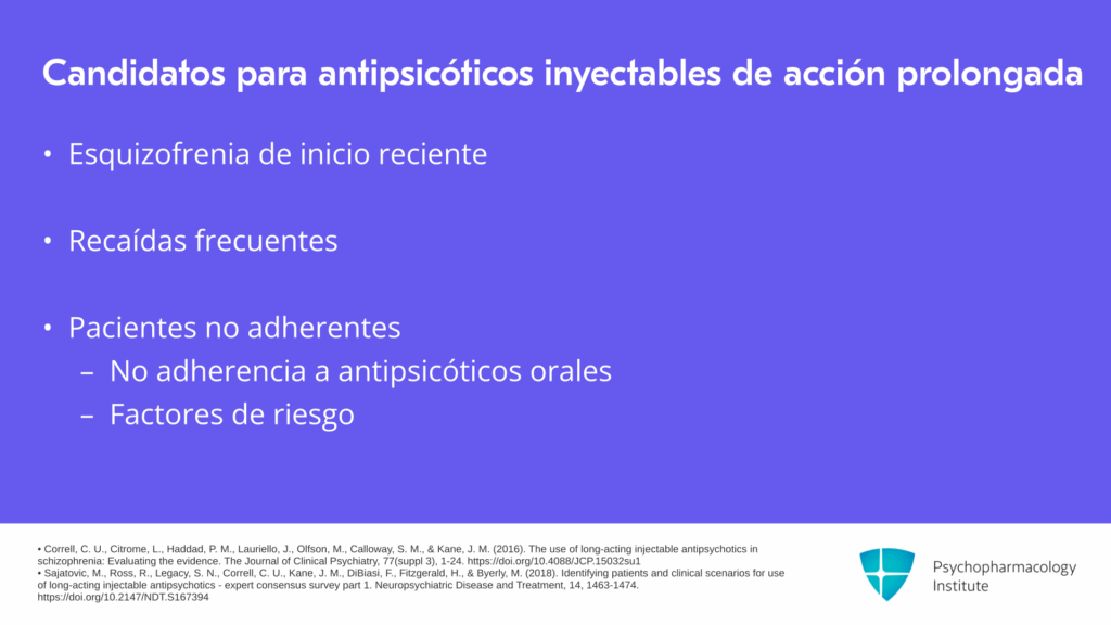 Otros candidatos incluyen pacientes con esquizofrenia de inicio reciente, aquellos con recaídas frecuentes, pacientes que no cumplen con los antipsicóticos orales, así como pacientes con factores de riesgo para la falta de adherencia a la medicación, específicamente aquellos con síntomas graves, deterioro cognitivo, disminución de la conciencia de enfermedad, comorbilidad por uso de sustancias y actitudes negativas hacia los medicamentos.