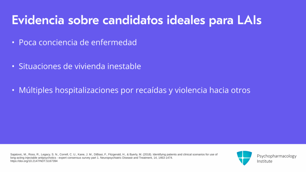 ¿Qué nos dice la evidencia sobre buenos candidatos para LAI? Una encuesta a más de 40 expertos en investigación y prescriptores con amplia experiencia con estos medicamentos encontró que los factores más importantes para seleccionar pacientes adecuados para LAI, aquellos elementos que recibieron la calificación más alta por más de la mitad de los encuestados, incluían pacientes con poca conciencia de su enfermedad y necesidad de tratamiento, personas sin hogar o con situaciones de vivienda inestable, pacientes con múltiples hospitalizaciones por recaídas y pacientes con antecedentes de violencia hacia otros.