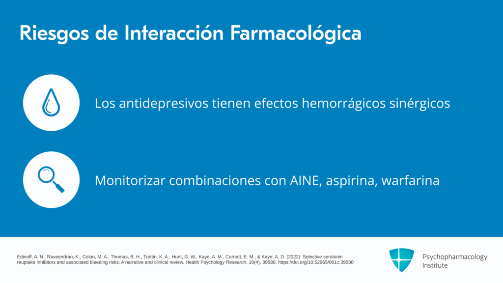 Los antidepresivos pueden actuar sinérgicamente con otros medicamentos que aumentan el riesgo de sangrado, y también hay efectos antiplaquetarios y receptores de serotonina en las plaquetas. Por lo tanto, el riesgo de sangrado para pacientes que también toman AINE, aspirina, warfarina, es algo en lo que deben pensar.