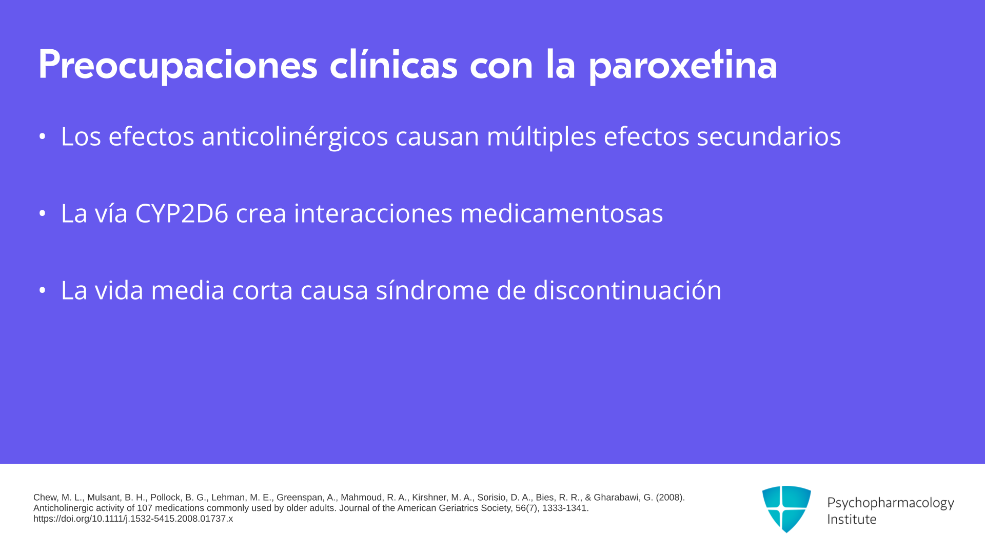 Mencionaré algunas perlas donde podríamos considerar prescribir un poco diferente que para nuestra población adulta promedio. Paroxetina o Paxil es un medicamento que generalmente trato de evitar recetar en adultos mayores. Y la razón es que es anticolinérgico, por lo que puede provocar efectos secundarios como estreñimiento, retención urinaria, confusión. También es tanto un sustrato como un inhibidor de la vía CYP2D6, por lo que puede tener más interacciones medicamentosas. También tiene una vida media muy corta. Así que si las personas dejan el medicamento abruptamente, puede provocar un síndrome de discontinuación grave.