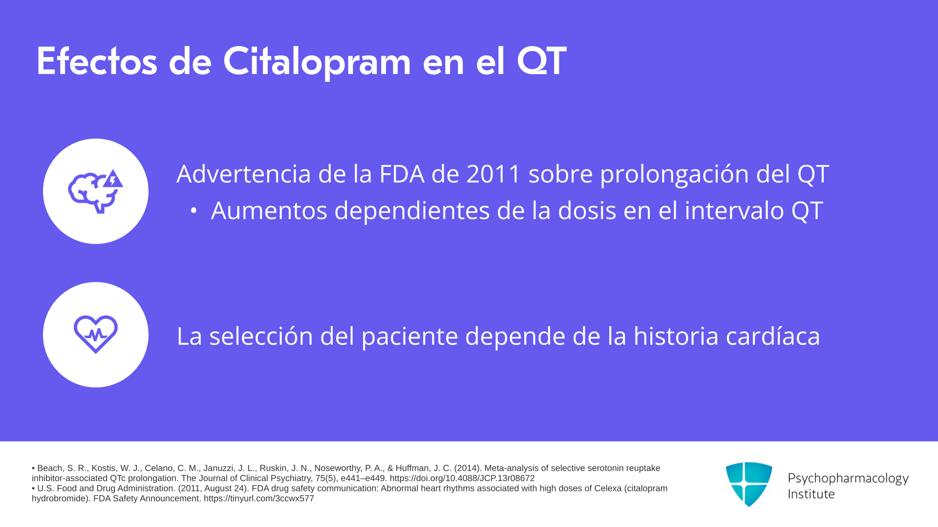 Citalopram. Solo mencionaré la advertencia de la FDA de 2011 que fue específica para citalopram, que hablaba sobre aumentos dependientes de la dosis en el intervalo QT. Y cuando se analizan esos estudios, generalmente está en el rango de 10 a 12 mseg que el QT puede prolongarse. Sin embargo, debido a la monitorización recomendada del ECG y la discusión del perfil riesgo-beneficio con los pacientes, probablemente se receta un poco menos ampliamente en los Estados Unidos que antes de esa advertencia de la FDA. Como lo veo, si tiene un paciente con un intervalo QT basal normal, si su intervalo QT aumenta en 12 segundos en un QTc normal, probablemente no sea gran cosa. Para alguien que tiene antecedentes de intervalo QT prolongado, este puede no ser un medicamento que le gustaría comenzar como primera línea.