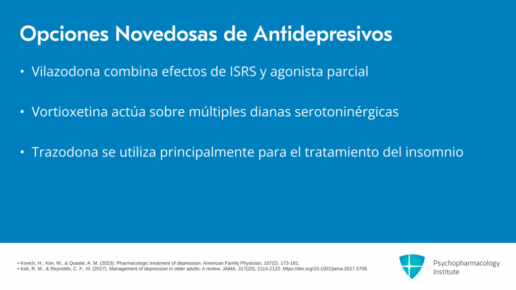 Algunos otros medicamentos. Vidazolona actúa como un ISRS y también tiene un agonista parcial del receptor de serotonina, por lo que funciona con varios mecanismos diferentes. Vortioxetina es un antidepresivo novedoso con efectos sobre múltiples receptores de serotonina y sobre el transportador de serotonina. Trazodona o Desyrel es otro medicamento que a menudo usamos para el tratamiento del insomnio a dosis más bajas de las que usaríamos para la depresión.