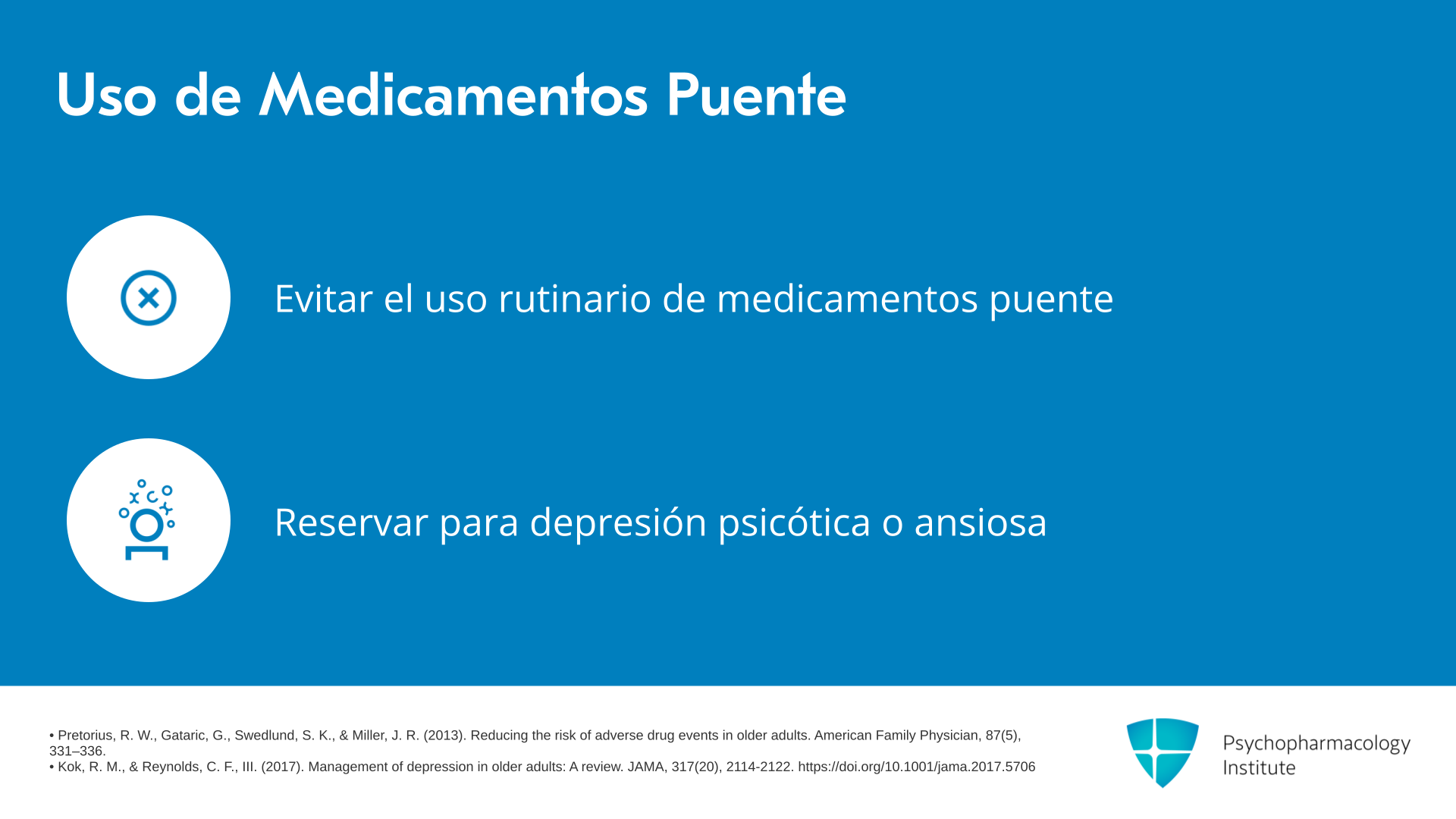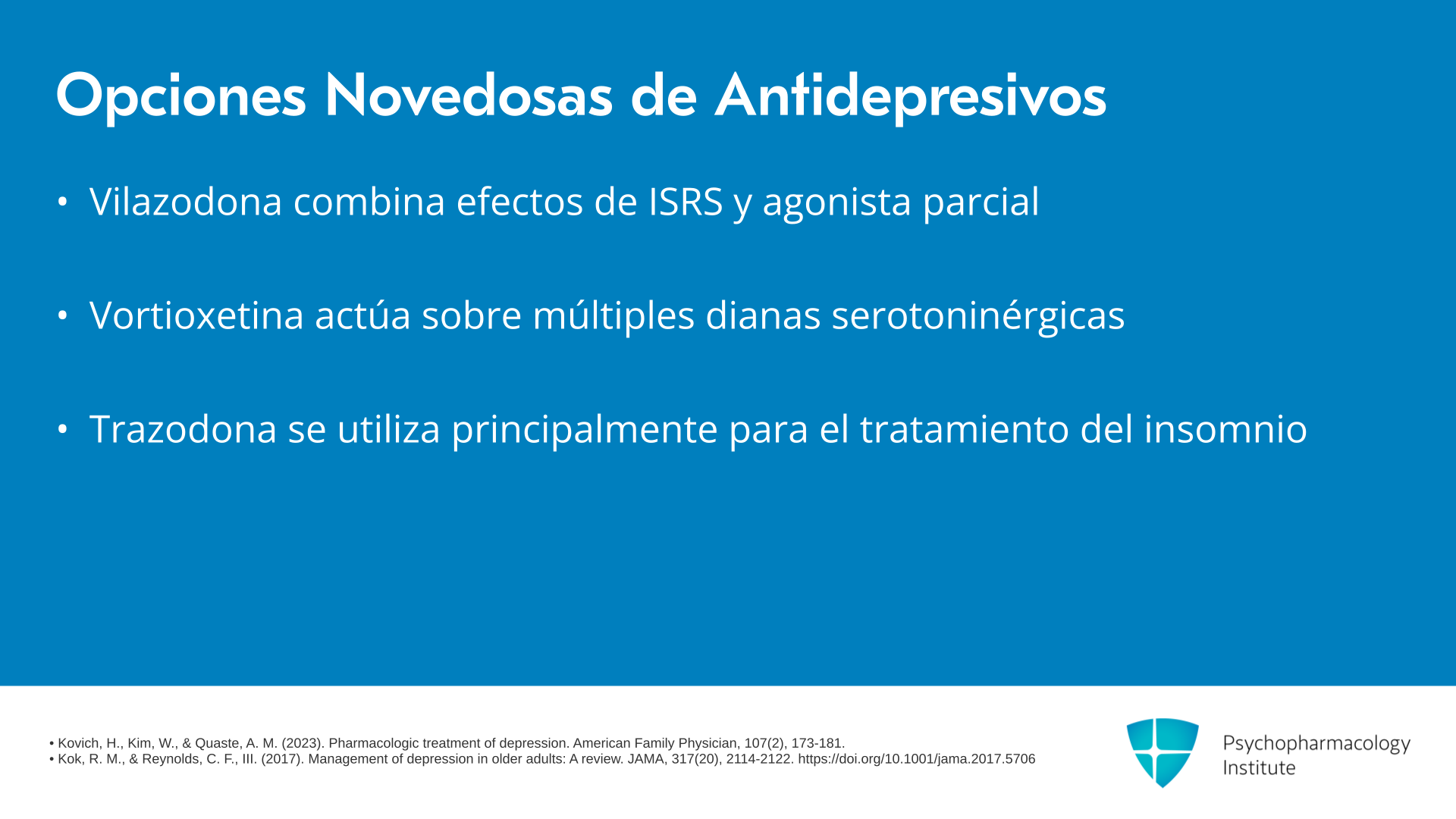 - Considere sertralina, citalopram o escitalopram como antidepresivos de primera línea en adultos mayores.