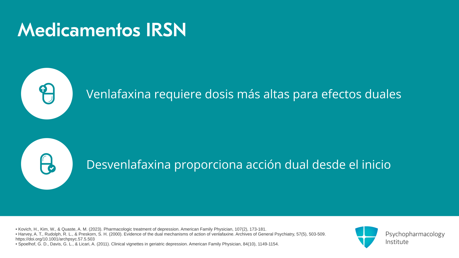 - Los IRSN (duloxetina, venlafaxina, desvenlafaxina) son beneficiosos en pacientes con depresión y dolor crónico concomitante.