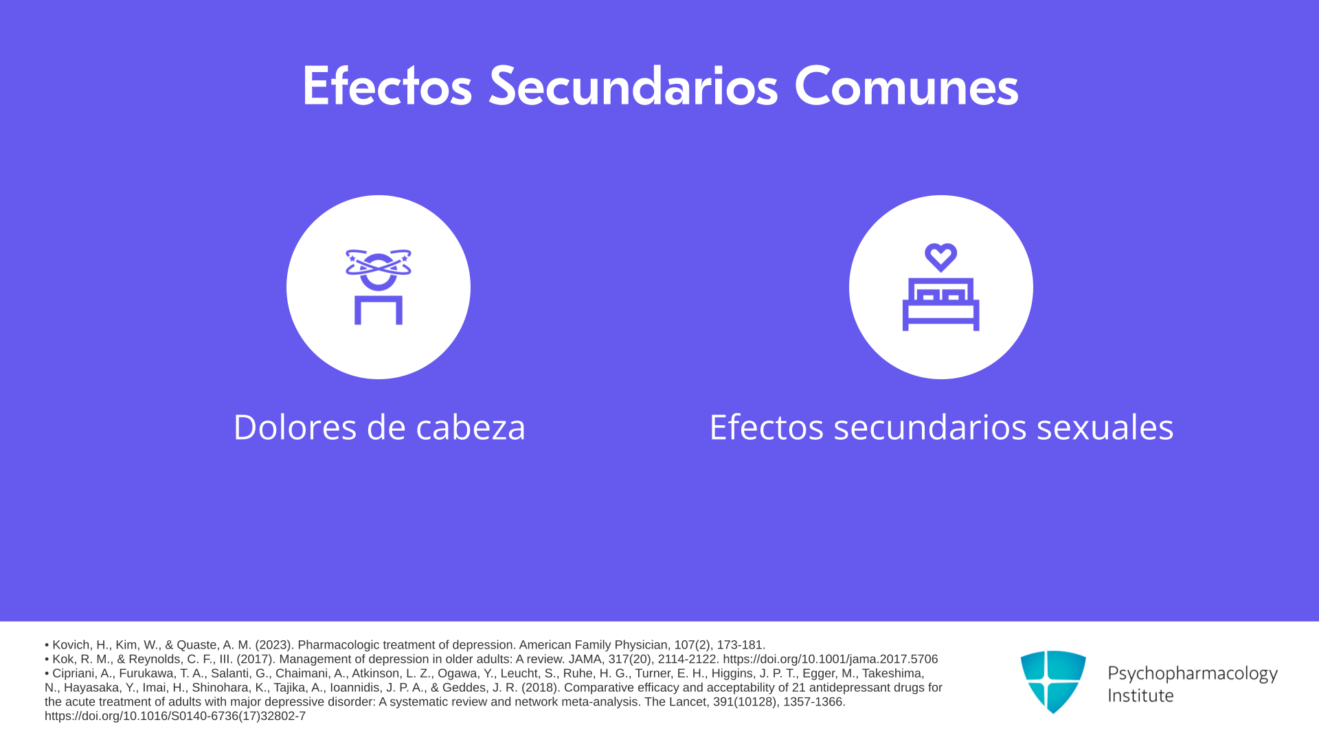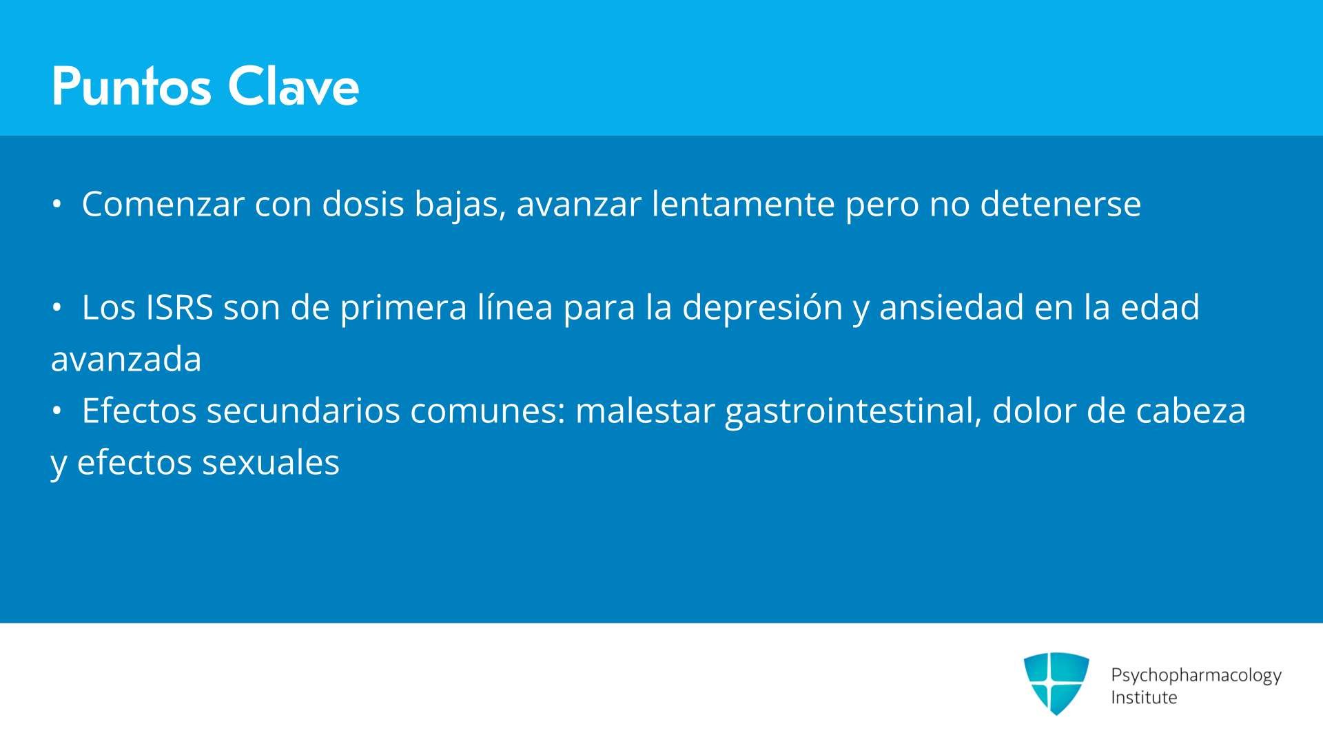 Puntos clave para esta sección: Nuestro mantra general de prescripción en Geriatría es comenzar con dosis bajas, avanzar lentamente, pero no detenerse y tener paciencia. Estos medicamentos pueden tardar en hacer efecto. Los ISRS son generalmente el tratamiento de primera línea para la depresión y la ansiedad en la edad avanzada. Los efectos secundarios más comunes de los ISRS son malestar gastrointestinal, dolor de cabeza y efectos secundarios sexuales.