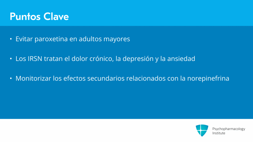 De los ISRS, generalmente evitaremos usar paroxetina en adultos mayores debido a las propiedades anticolinérgicas. Los IRSN están indicados para el dolor crónico, la depresión y la ansiedad, pero relacionado con ese efecto de norepinefrina, debemos estar atentos a los efectos secundarios, incluida la activación y el aumento de la presión arterial.