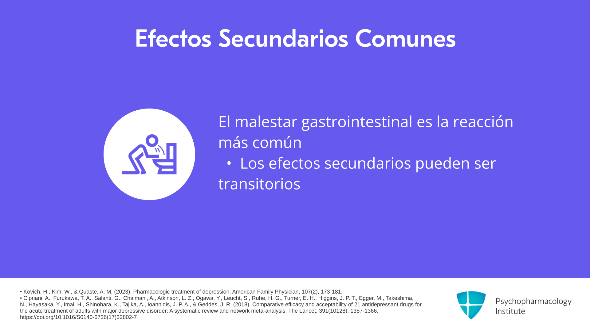 En términos de los efectos secundarios más comunes que vemos, hay muchos receptores serotoninérgicos en nuestro cerebro. También hay muchos receptores serotoninérgicos en nuestro tracto gastrointestinal. Por lo tanto, malestar gastrointestinal, náuseas, vómitos, malestar estomacal, esos tienden a ser los efectos secundarios más comunes que vemos. Sin embargo, estos pueden ser transitorios. Y a veces, continuar con el medicamento o tomarlo con alimentos puede ayudar.