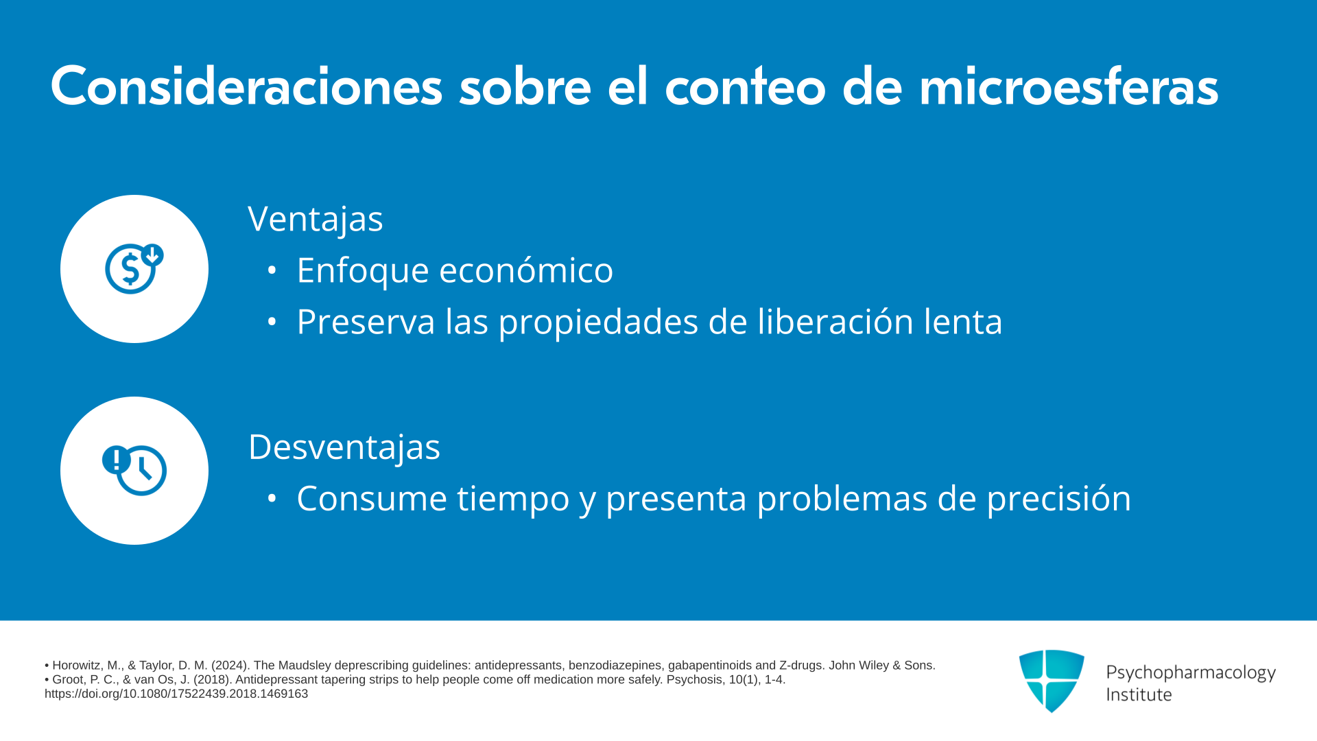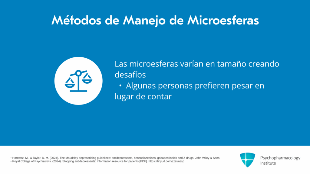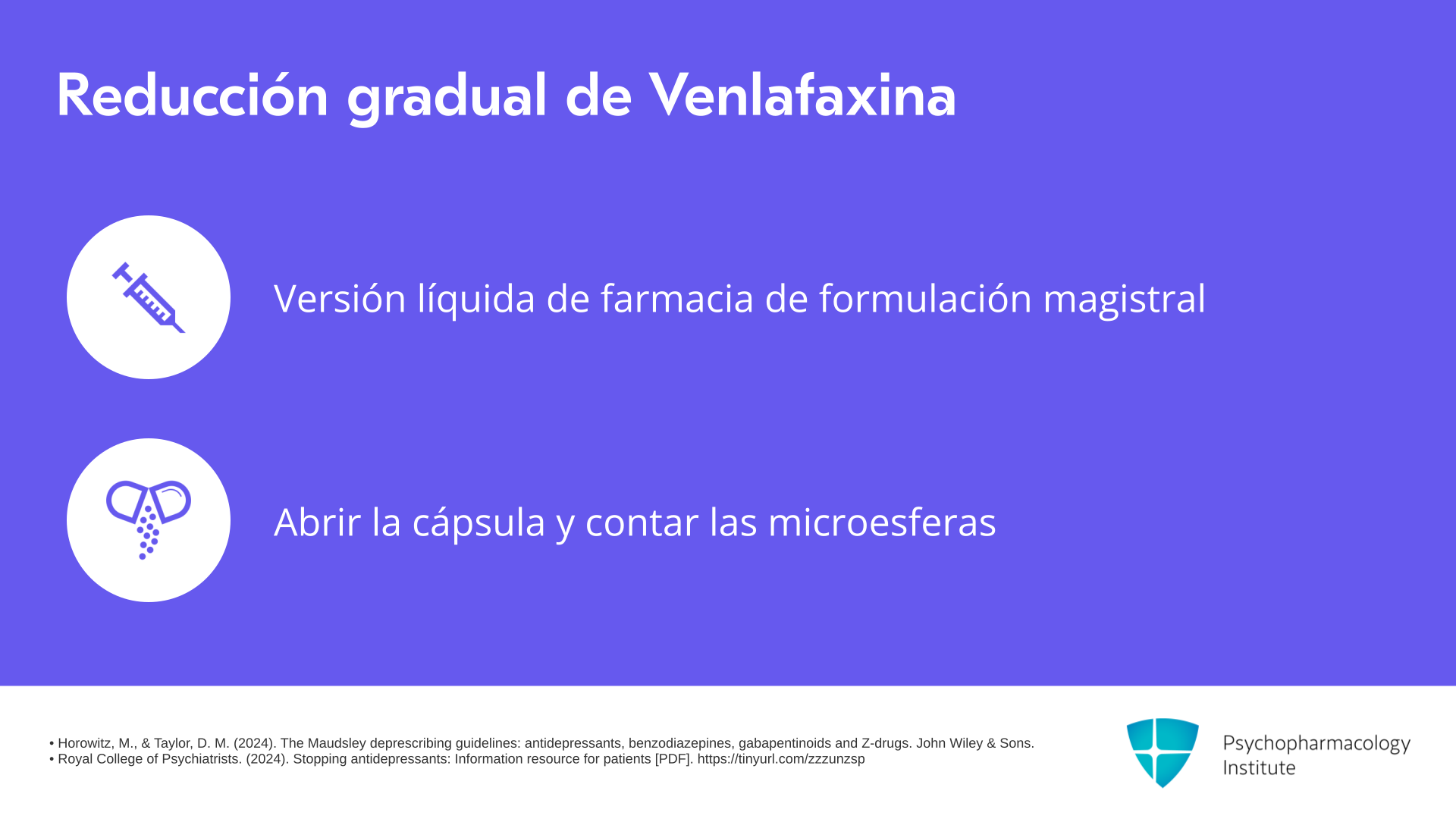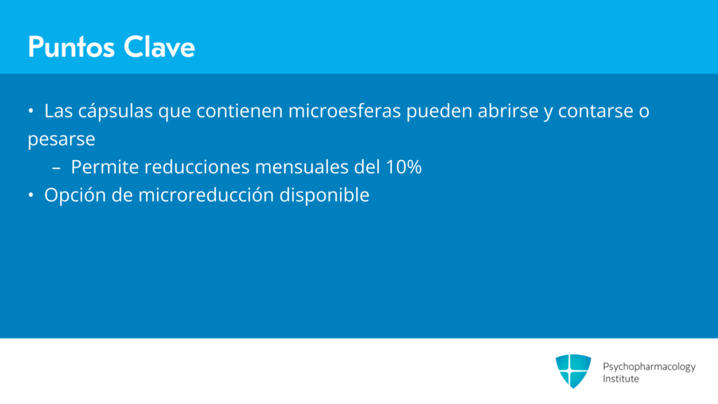 Los puntos clave aquí son: Algunos medicamentos como la venlafaxina y la duloxetina se suministran como cápsulas que contienen microesferas. Estas pueden abrirse y contarse o pesarse, o ser preparadas por farmacias de formulación magistral. Esto permite reducciones de aproximadamente un 10% por mes. Otra opción son reducciones aún más pequeñas, lo que se conoce como microreducción.