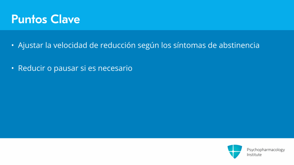 Y la velocidad de reducción debe ajustarse a los síntomas de abstinencia de cada individuo – disminuirse, pausarse o aumentarse la dosis si los síntomas se vuelven demasiado severos.