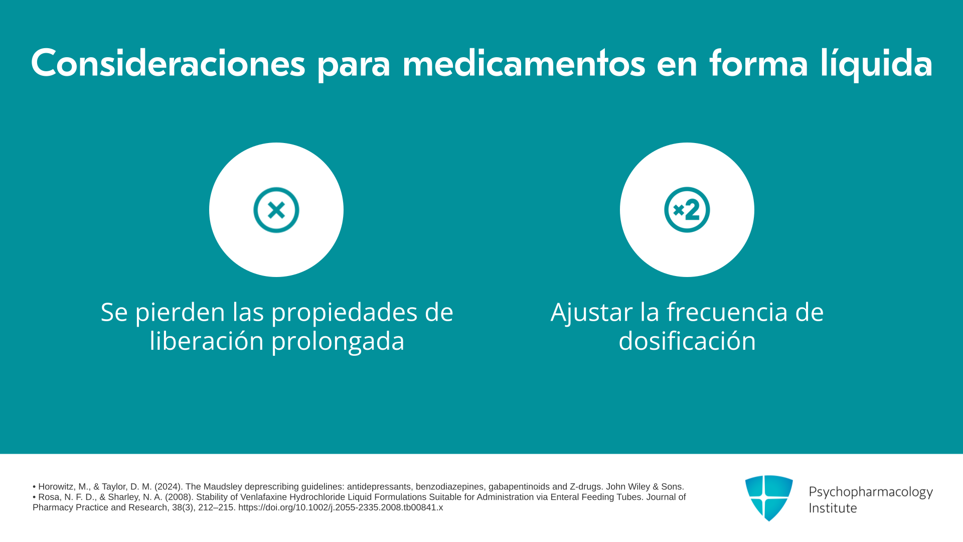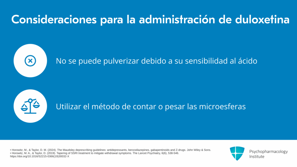 - La duloxetina requiere conteo o pesaje de gránulos para su reducción, ya que es sensible al ácido y no puede triturarse ni convertirse en líquido.