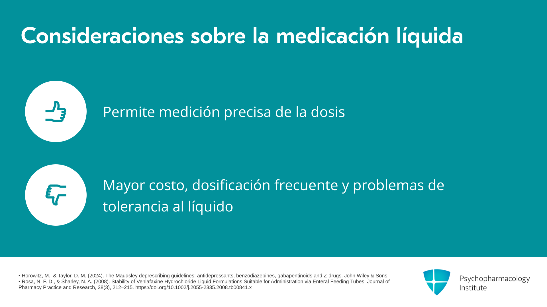 La ventaja de un líquido en estos casos es que permite una medición muy precisa de la dosis con una jeringa. Las desventajas son el costo adicional y el hecho de que debe tomarse dos o tres veces al día. Algunas personas no toleran bien los líquidos. En algunos casos, puede que lo absorban más rápido o que los conservantes utilizados no sean compatibles con algunas personas, por lo que es recomendable ser cautelosos y observar cómo responden a esto.