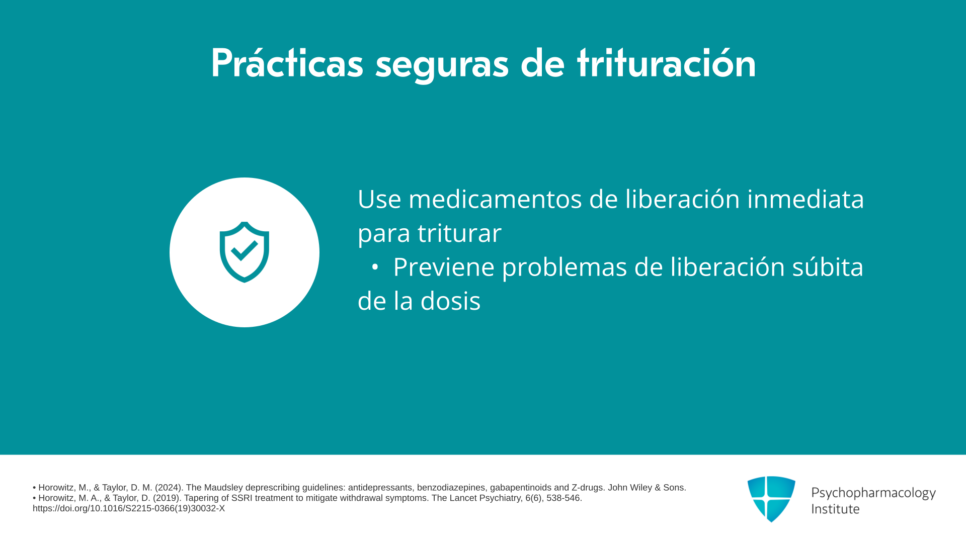 - Triturar y suspender tabletas es más adecuado para los fármacos de liberación inmediata, ya que existe riesgo de liberación brusca si se trituran formulaciones de liberación prolongada.