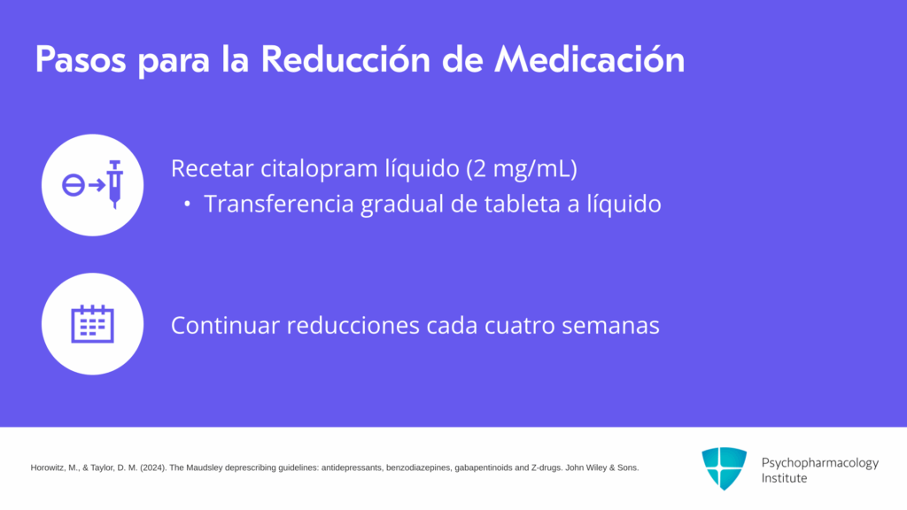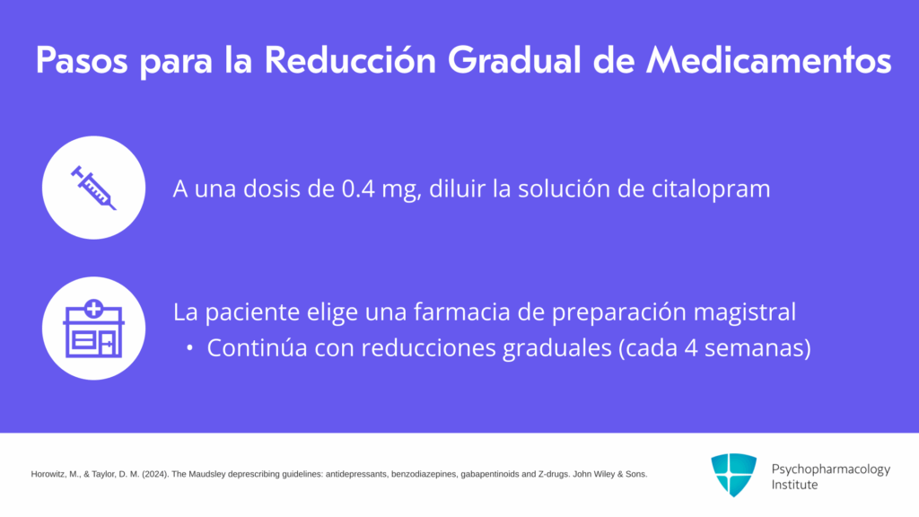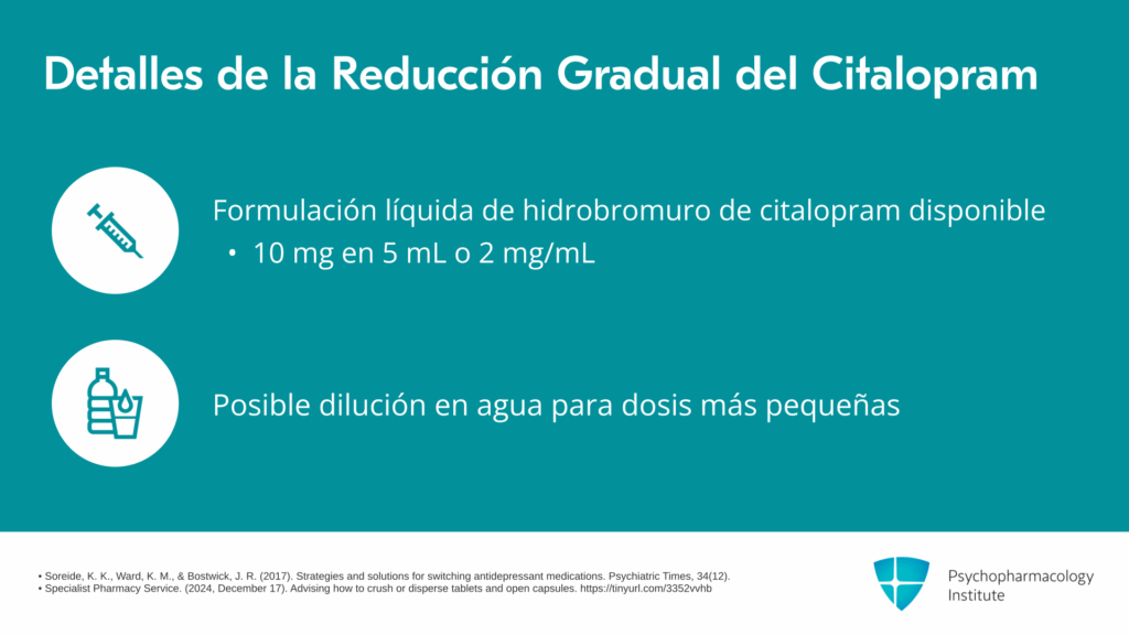Les daré un ejemplo de cómo realizar la reducción gradual del citalopram. El hidrobromuro de citalopram está disponible como líquido en Estados Unidos. Viene como 10 mg en 5 mL o 2 mg/mL. Pueden usar una jeringa de 1 mL o 5 mL para preparar dosis entre 0.2 mg y 40 mg. Y si necesitan preparar dosis aún más pequeñas, pueden diluir la solución en agua. Por ejemplo, pueden tomar 1 mL de la solución de citalopram, mezclarla con 9 mL de agua, y agitar bien para preparar una solución de 0.2 mg/mL. Y usando una jeringa de 1 mL, pueden preparar fácilmente hasta 0.02 mg del medicamento.