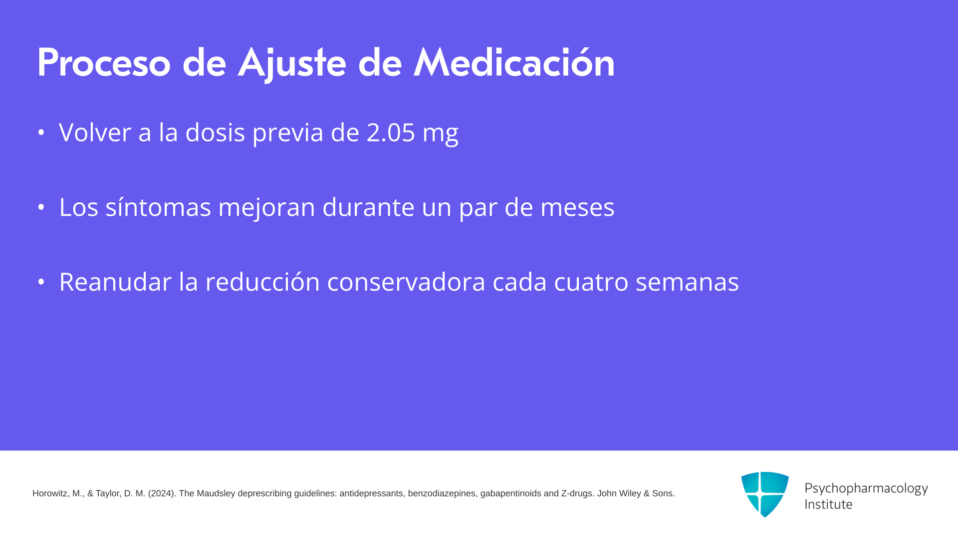 - Horowitz, M., & Taylor, D. M. (2024). The Maudsley deprescribing guidelines: antidepressants, benzodiazepines, gabapentinoids and Z-drugs. John Wiley & Sons.