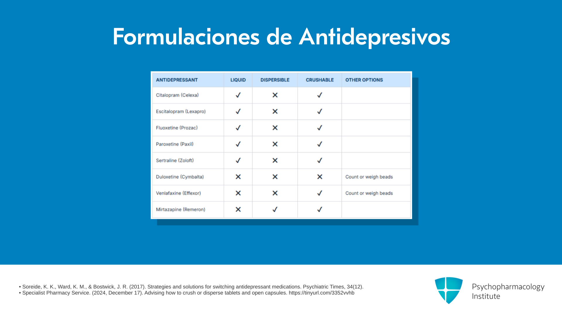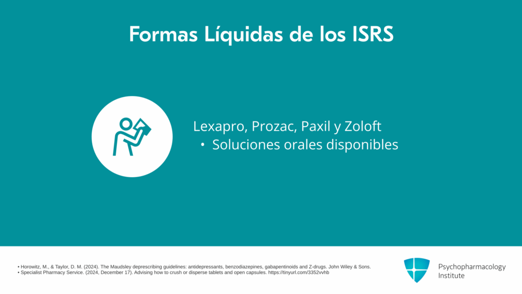 Aquí hay una tabla que resume, en Estados Unidos, qué medicamentos vienen en preparación líquida del fabricante, cuáles vienen como tabletas dispersables que pueden disolverse en un vaso de agua, y cuáles son triturables y por lo tanto podrían usarse fuera de indicación para hacer una suspensión. Como pueden ver, hay aproximadamente cinco ISRS disponibles en forma líquida en Estados Unidos. La mirtazapina está disponible como tableta dispersable, y la mayoría de ellos son triturables excepto la duloxetina.