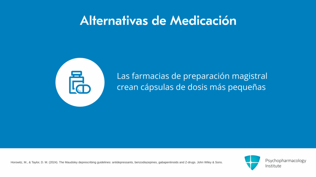 Y por supuesto, una alternativa para todos los medicamentos es conseguir que una farmacia de preparación magistral elabore cápsulas o tabletas de dosis más pequeñas para facilitar la vida a algunos pacientes que prefieren algo más simple.