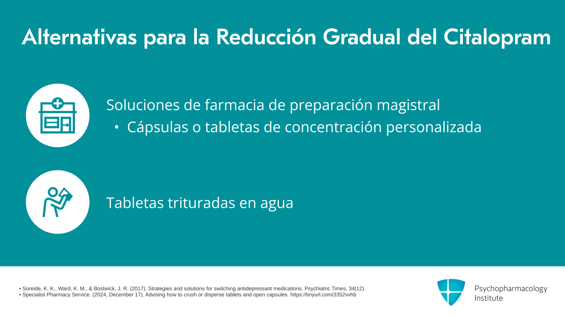 Las opciones alternativas para la reducción gradual del citalopram serían que una farmacia de preparación magistral elabore cualquier concentración de solución, cápsula o tableta para igualar algunas de las dosis descritas anteriormente. Y las tabletas de citalopram pueden triturarse y mezclarse con agua para formar una suspensión si se agitan bien antes de usarse, como opción si las farmacias de preparación magistral o el líquido no están disponibles por alguna razón.