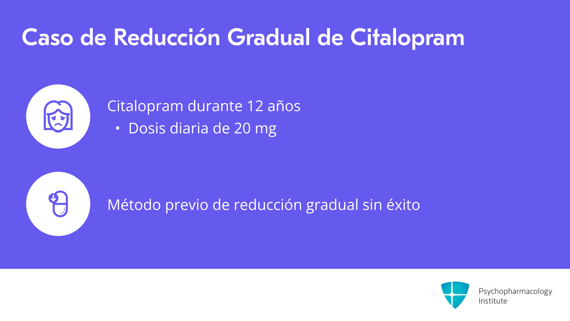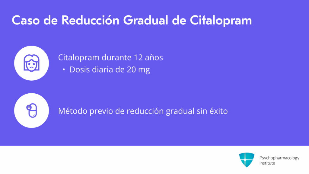 Voy a describir un ejemplo de reducción gradual para la Sra. Smith con citalopram. Esta es una mujer que ha estado tomando citalopram durante mucho tiempo, 12 años, 20 mg por día. Se sintió muy deprimida cuando su madre falleció, pero ha mejorado en los últimos años. Ha intentado suspender sus medicamentos varias veces, y cada vez su médico le indicó reducir la dosis a la mitad, a 10 mg, partiendo la tableta por dos semanas, y luego tomando media tableta cada dos días durante dos semanas antes de suspenderla.