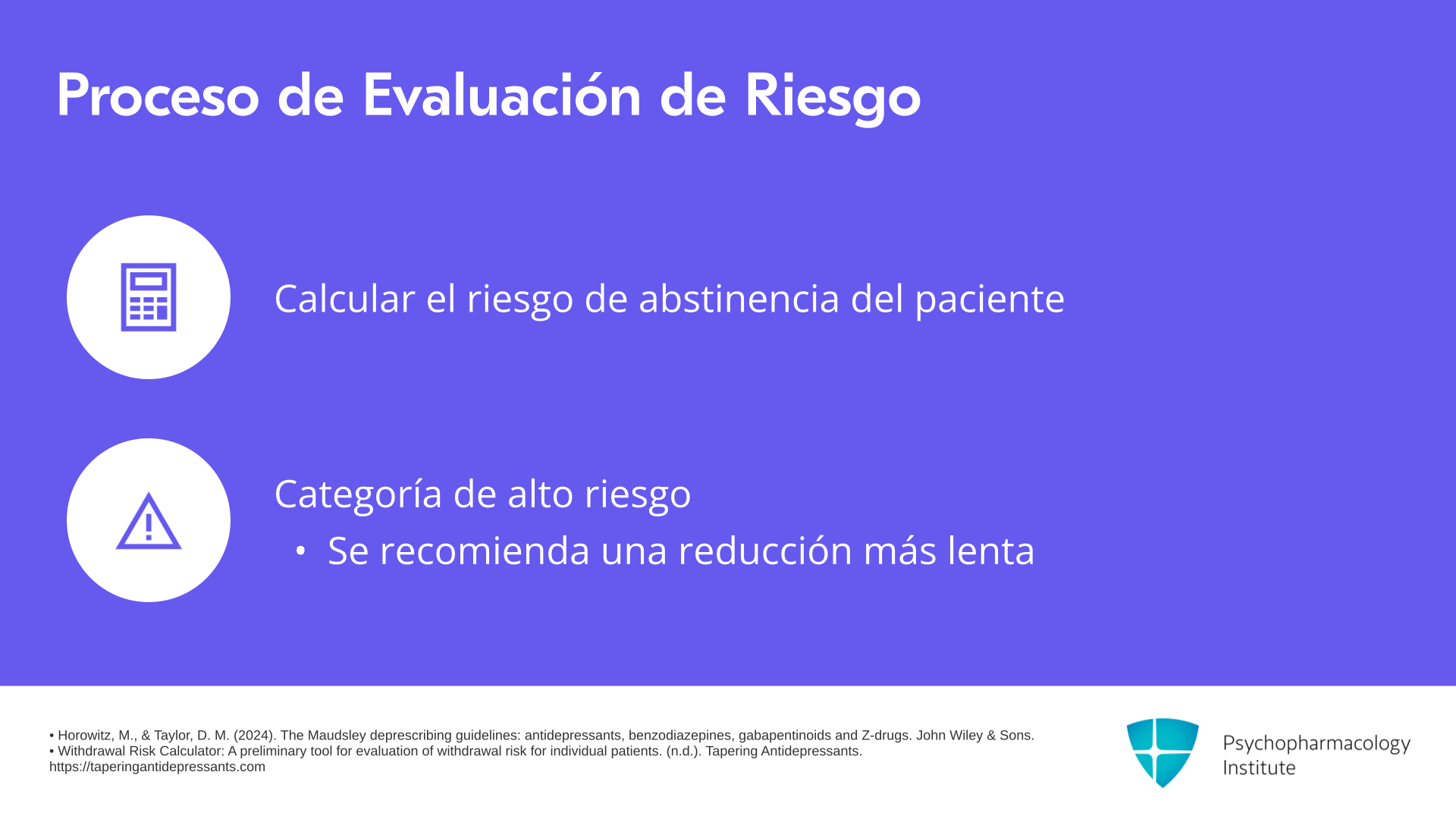 Ustedes calculan su riesgo según la calculadora de riesgo en las Directrices de Desprescripción de Maudsley: 3 puntos por uso a largo plazo, 2 puntos por riesgo moderado porque el citalopram tiene un riesgo intermedio en comparación con otros antidepresivos, 0 puntos por la dosis mínima y 2 puntos por haber tenido efectos graves de abstinencia en el pasado. Esto le da 7 puntos en total y la coloca en una categoría de alto riesgo, lo que sugiere una reducción más lenta.