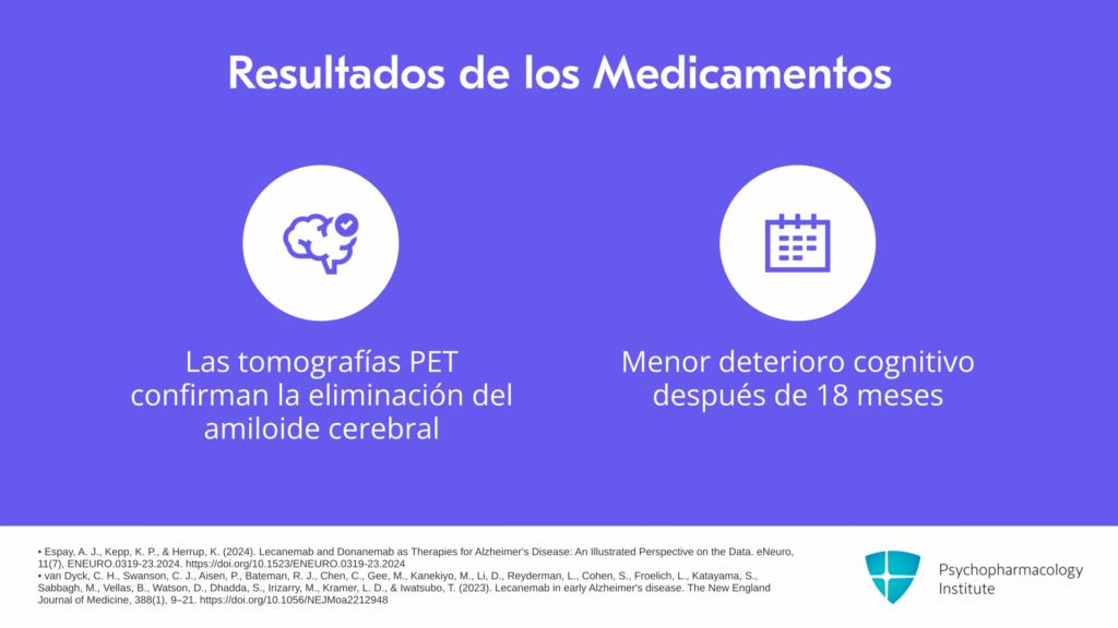 Las tomografías PET han demostrado que estos medicamentos pueden llevar a la eliminación del amiloide cerebral. En ensayos de investigación con lecanemab y donanemab, encontraron que las personas con síntomas leves de enfermedad de Alzheimer experimentaron menos deterioro en el pensamiento y la función diaria a los 18 meses con el medicamento. Por lo tanto, hubo una moderada ralentización del deterioro cognitivo.
