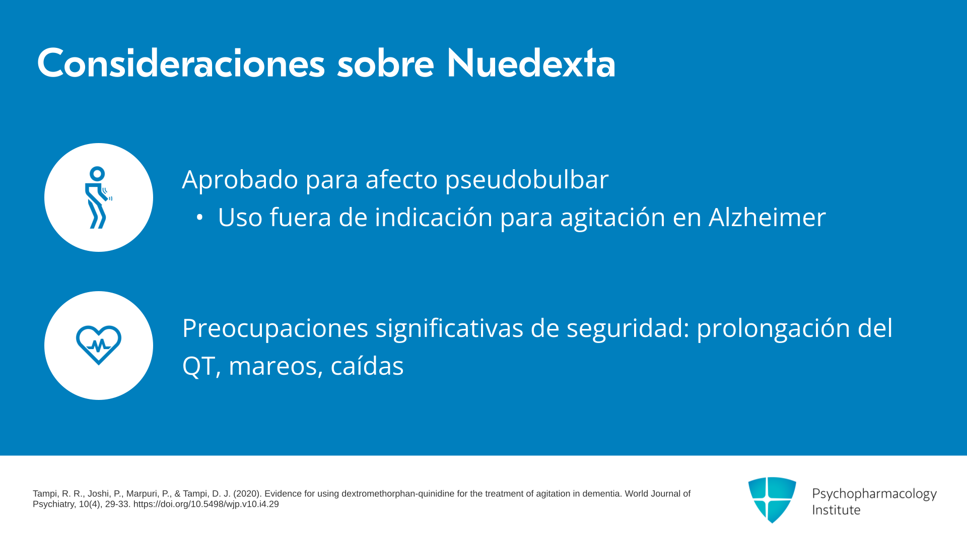 Mencionaré Nuedexta o dextrometorfano/quinidina, que es una combinación aprobada para el afecto pseudobulbar, que se usa fuera de indicación para la agitación en la enfermedad de Alzheimer. Esto ha sido investigado para uso fuera de indicación a través de un estudio llamado TRIAD, que demostró mejoras estadísticamente significativas en los síntomas de agitación para pacientes que viven con demencia. Sin embargo, existen algunas preocupaciones significativas de seguridad, incluida la prolongación del intervalo QT, mareos y caídas. Se debe usar con precaución en ancianos frágiles y requiere monitoreo con electrocardiogramas.