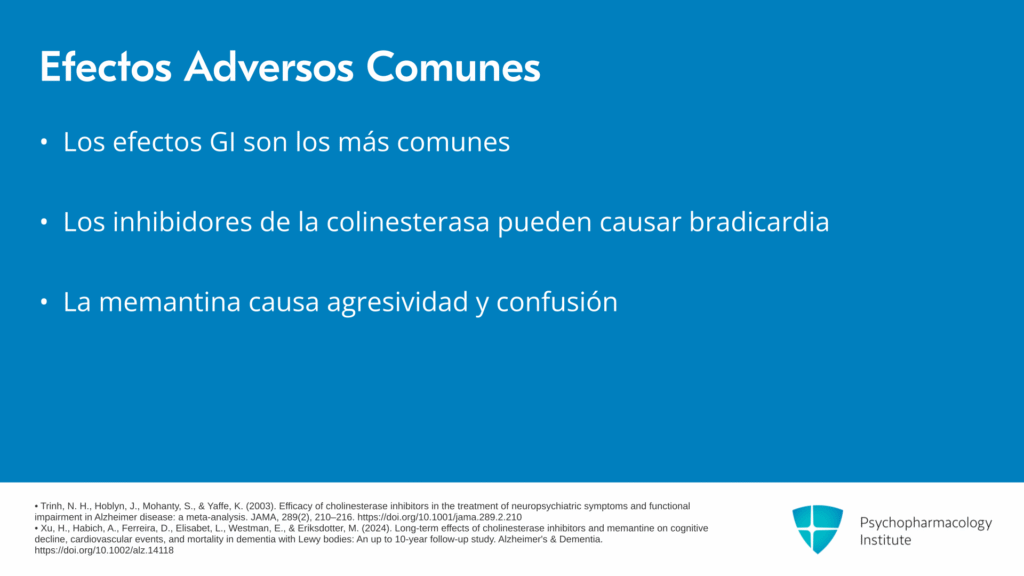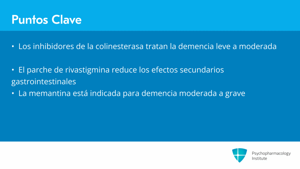 Puntos clave para esta sección: Los inhibidores de la colinesterasa están indicados para demencia leve a moderada y los principales efectos secundarios incluyen náuseas, vómitos y diarrea. Si esos efectos secundarios gastrointestinales se vuelven demasiado problemáticos con medicamentos orales, existe un parche transdérmico, el parche de rivastigmina que puede utilizarse. La memantina está indicada para demencia moderada a grave y los principales efectos secundarios incluyen confusión, dolores de cabeza, mareos y agresividad.