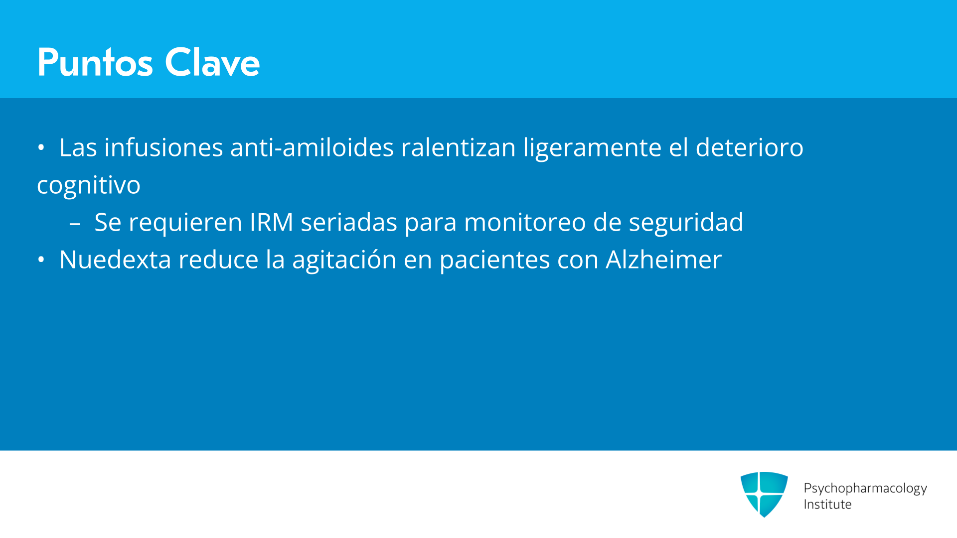 Las infusiones anti-amiloides para la enfermedad de Alzheimer temprana con patología amiloide confirmada pueden ralentizar ligeramente el deterioro cognitivo, pero hay efectos secundarios significativos, incluido ARIA, que son hemorragias cerebrales e inflamación, y estos medicamentos requieren IRM seriadas para su monitoreo. Nuedexta o dextrometorfano/quinidina puede reducir la agitación en pacientes con enfermedad de Alzheimer, pero requiere precaución debido a la prolongación del intervalo QT y el riesgo de caídas.