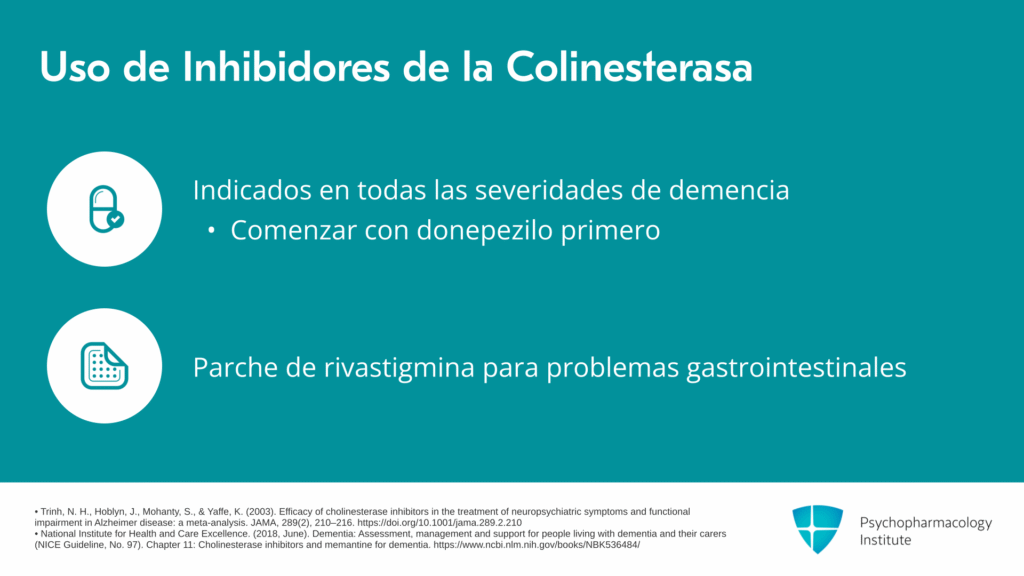 El uso de inhibidores de la colinesterasa está indicado en todos los niveles de gravedad de la demencia. Generalmente, comenzamos con donepezilo o Aricept primero y luego cambiamos de agente si se desarrollan efectos secundarios. Para pacientes que tienen efectos secundarios gastrointestinales significativos con el uso de medicamentos orales, existe un parche transdérmico de rivastigmina que generalmente puede ayudar a evitar algunos de esos efectos secundarios gastrointestinales.