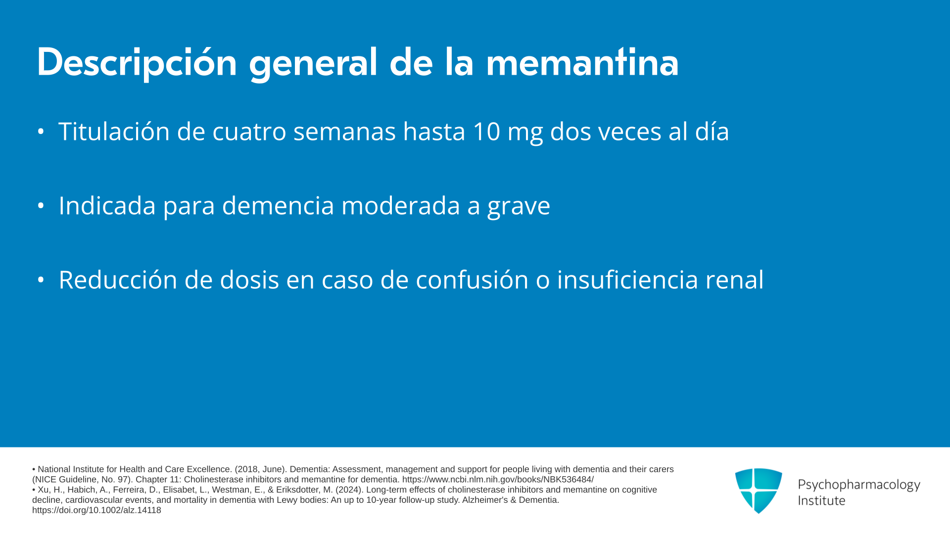 La memantina generalmente se titula durante cuatro semanas hasta 10 mg dos veces al día o una versión de liberación prolongada de 28 mg, y está indicada para demencia moderada a grave. A menudo consideramos reducir la dosis si los pacientes presentan confusión persistente o insuficiencia renal crónica.