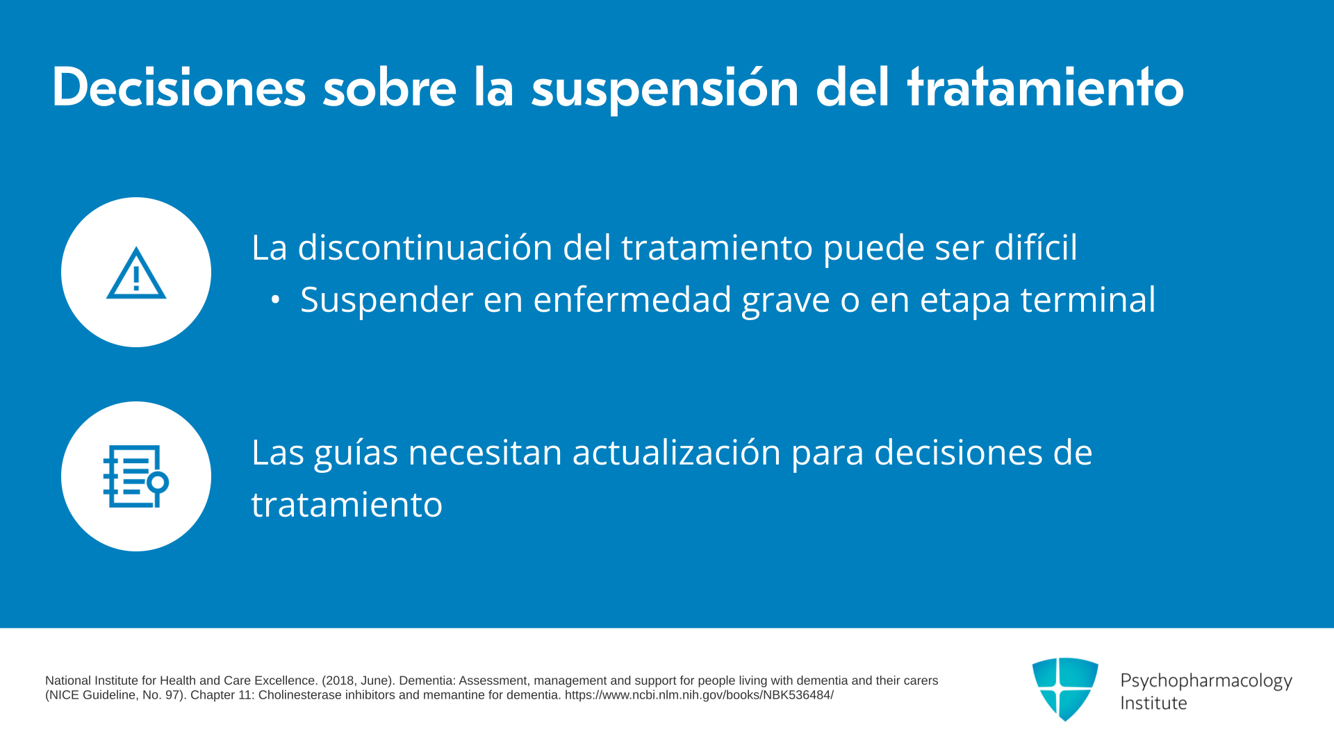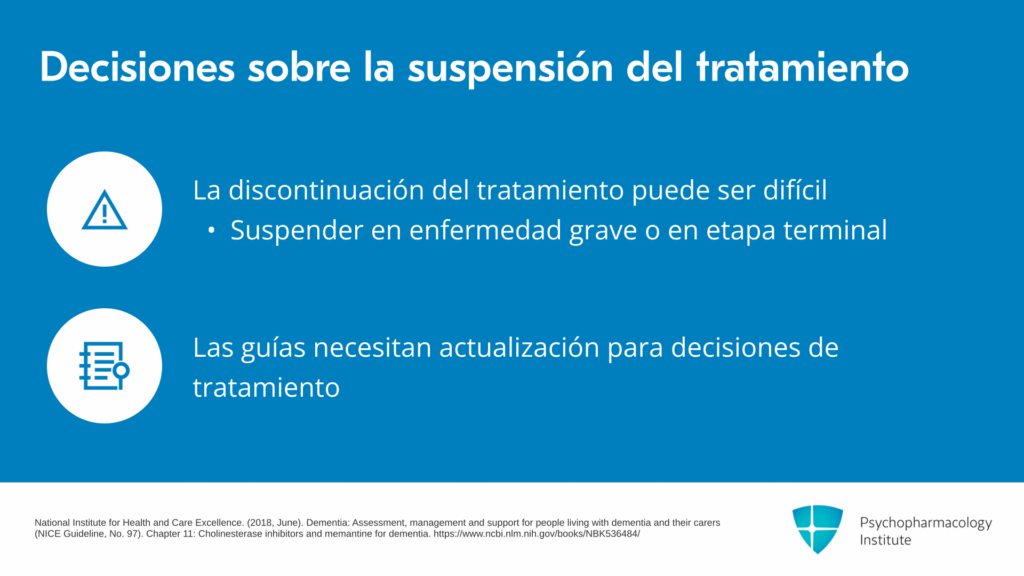 La decisión de cuándo suspender el tratamiento puede ser difícil. En general, recomendamos suspender el tratamiento en enfermedad grave o en etapa terminal donde hay incapacidad para responder al entorno, dependencia de otros para la mayoría de las actividades de la vida diaria o hay una expectativa de vida limitada, como cuando las personas ingresan a cuidados paliativos. Pero realmente se necesita una actualización de las guías, tanto para iniciar como para discontinuar estos tratamientos.