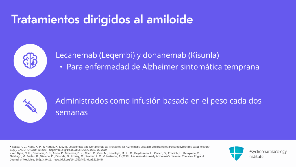 Los agentes más nuevos que están disponibles son tratamientos dirigidos al amiloide para personas que viven con enfermedad de Alzheimer sintomática temprana con patología amiloide confirmada. Los dos medicamentos disponibles son lecanemab y donanemab, que son Leqembi o Kisunla, y estos medicamentos se unen al amiloide y eliminan su acumulación. Se administran como una infusión cada dos semanas, y la dosis se basa en el peso.