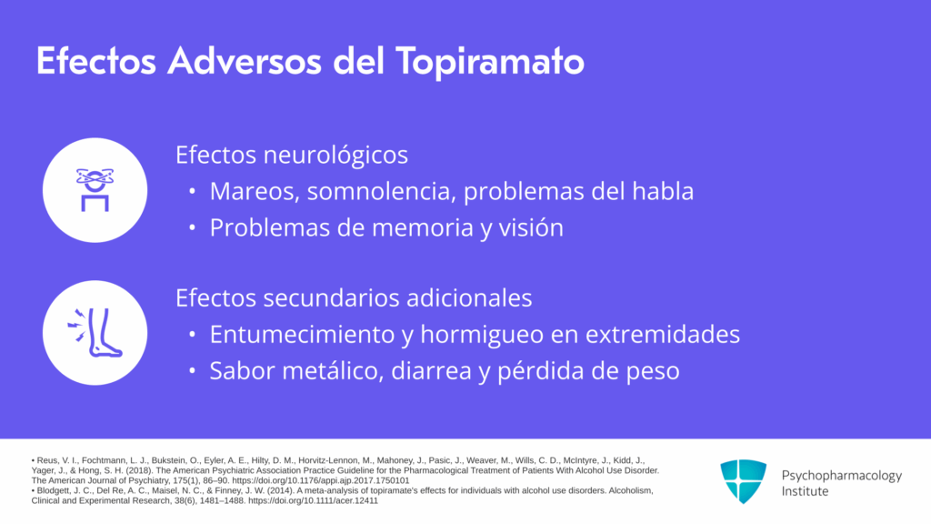 Los efectos secundarios del topiramato incluyen mareos y somnolencia; problemas con el habla, la memoria y la visión – estos realmente hacen que las personas lo abandonen; entumecimiento, hormigueo y ardor en brazos y piernas, lo cual es un poco sorprendente dado que debería ser como la gabapentina pero no lo es; ese sabor metálico, sensación de nerviosismo, dolores de estómago, diarrea, fiebre y pérdida de peso. A algunas personas realmente les gusta porque existe la leyenda urbana de que perderán mucho peso, pero a menudo las personas sí pierden algo de peso.