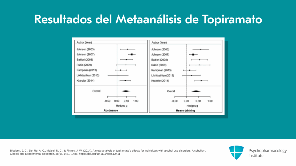 Blodgett, J. C., Del Re, A. C., Maisel, N. C., & Finney, J. W. (2014). A meta-analysis of topiramate’s effects for individuals with alcohol use disorders. Alcoholism, Clinical and Experimental Research, 38(6), 1481–1488. https://doi.org/10.1111/acer.12411