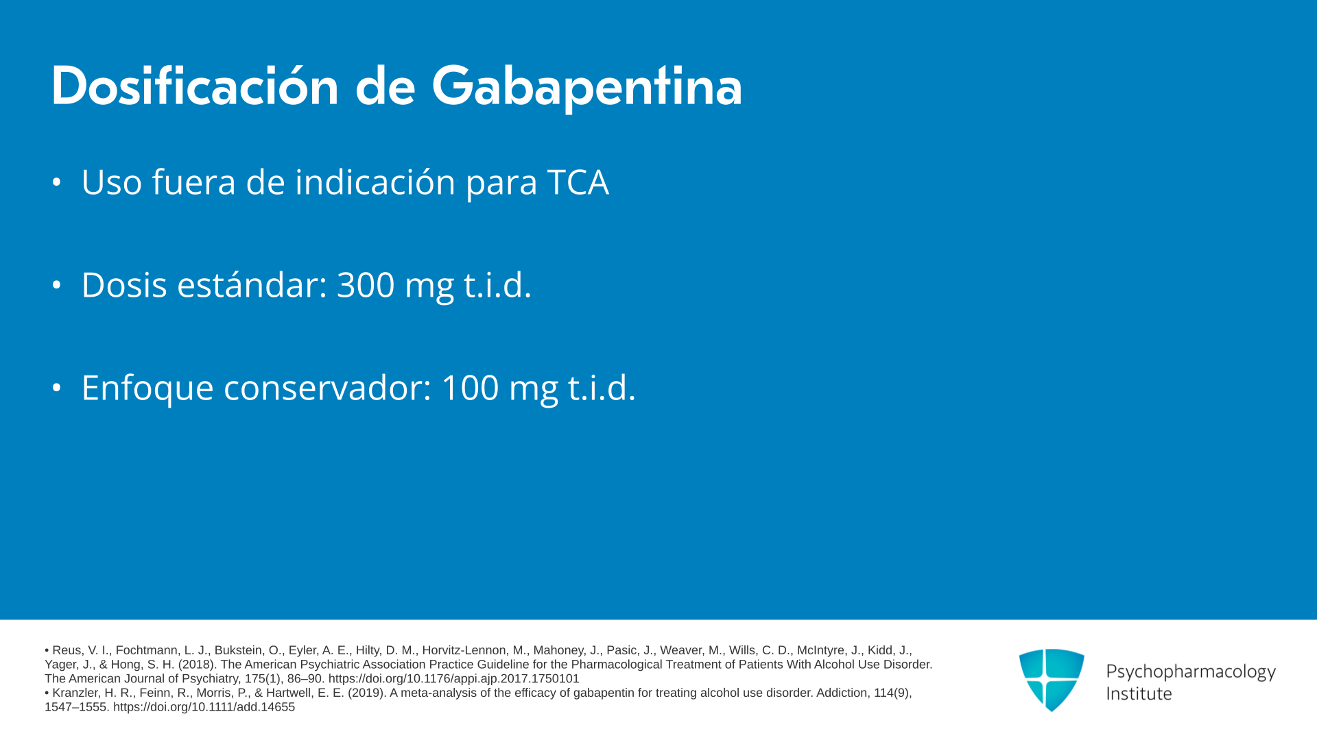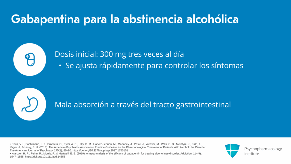 Gabapentina. También podría usarse fuera de indicación para el trastorno por consumo de alcohol. Aunque algunas personas comienzan directamente con 300 mg tres veces al día y eso es bien tolerado, si no es bien tolerado, alguien se vuelve demasiado sedado y no quiere usarlo. Yo utilizo un enfoque más conservador comenzando con 100 mg tres veces al día, especialmente en aquellos propensos a la sedación. Y luego, si es bien tolerado, pasaré a 200 mg tres veces al día o si no tienen sedación en absoluto, iré directamente a 300 mg tres veces al día después de una semana más o menos.