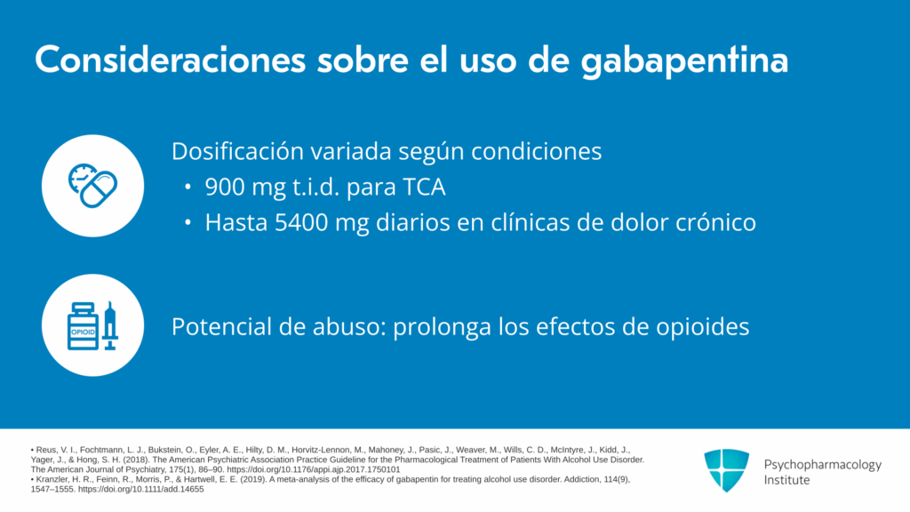 Así que entre quienes tratamos el trastorno por consumo de alcohol, podemos llegar hasta 900 mg tres veces al día. Pero en clínicas de dolor crónico, he visto dosis de hasta 5400 mg al día. En instituciones correccionales, debido a que es muy calmante, este es un medicamento que ha llegado a ser abusado por algunos. Y además, las personas tienden a sentir que prolonga el efecto de los opioides, por lo que también es abusado por aquellos con trastorno por consumo de opioides. Así que tengan cuidado y estén atentos a cualquier señal de uso excesivo.