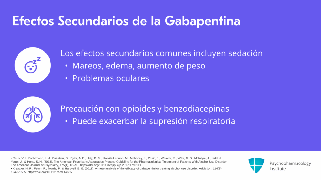 Efectos secundarios comunes. El más común es la sedación, pero también hay mareos, algo de edema, aumento de peso y problemas oculares. En entornos carcelarios, puede ser mal utilizada. Y cuando se combina con opioides o benzodiacepinas, puede exacerbar la supresión respiratoria. Así que si alguien llega a ustedes y ya está tomando una benzodiacepina y un opioide, lo cual automáticamente me pone en alerta, yo tendería a no añadir gabapentina a eso.