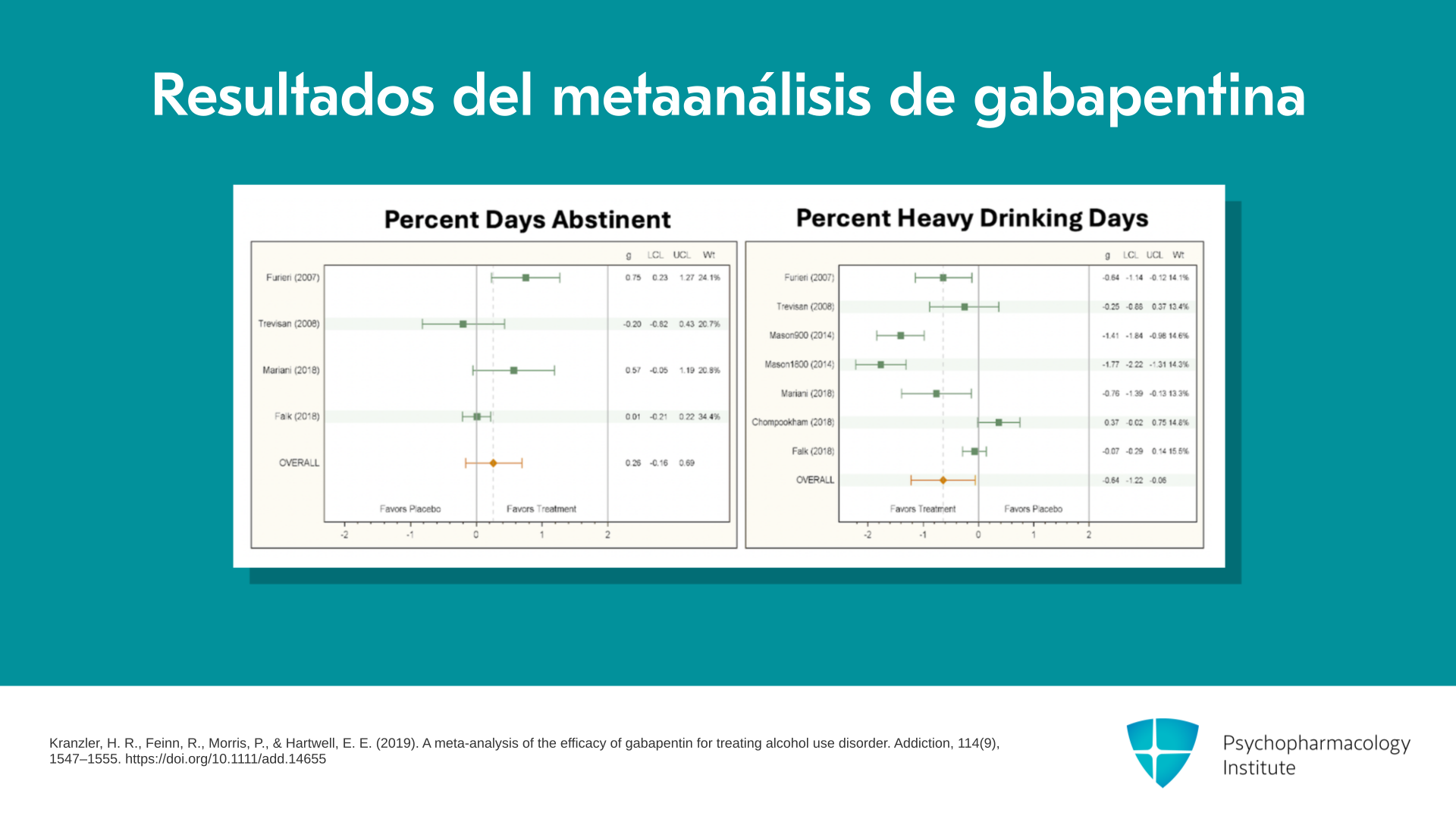 Si observamos el metaanálisis de Kranzler y colegas en 2019, pueden ver que los días actuales de consumo excesivo tienen un tamaño del efecto algo mayor, algo así como 0.3 frente a lo que resulta ser un efecto no significativo sobre la abstinencia. Por eso hablé primero del topiramato, porque en la mayoría de los criterios de valoración, el topiramato muestra eficacia para el tratamiento del trastorno por consumo de alcohol, mientras que la gabapentina es algo similar a la naltrexona al tener un efecto sobre los días de consumo excesivo pero no sobre la abstinencia.