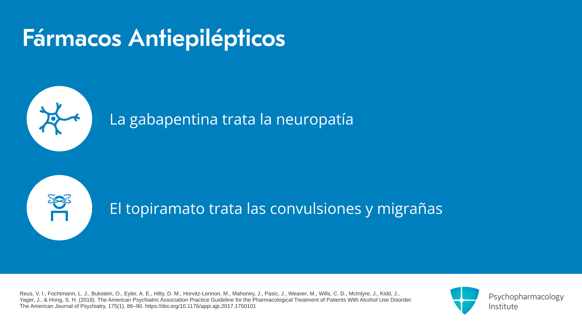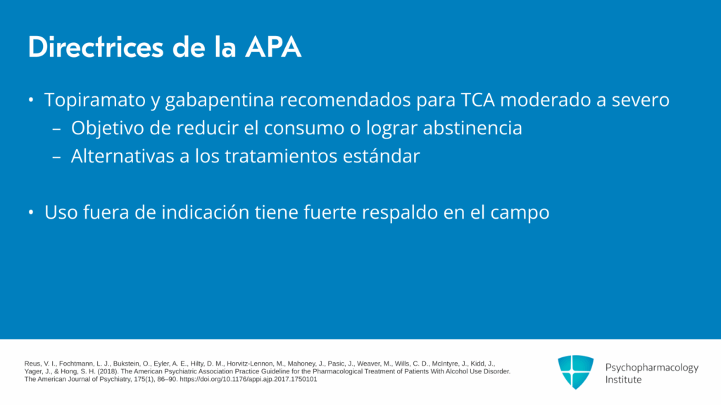 Comencemos con la declaración número 11 de las Directrices de la APA. Sugieren que el topiramato o la gabapentina pueden ofrecerse a pacientes con trastorno por consumo de alcohol moderado a severo que: uno, tienen como objetivo reducir el consumo de alcohol o lograr la abstinencia; dos, prefieren topiramato o gabapentina o no toleran o no han respondido a naltrexona y acamprosato, y no tienen contraindicaciones para el uso de estos medicamentos, como por ejemplo, alergias a ellos. Así que, aunque este uso es fuera de indicación, existe un apoyo bastante fuerte en el campo para el uso de estos medicamentos y no tendrían problemas al utilizarlos en personas con trastorno por consumo de alcohol.