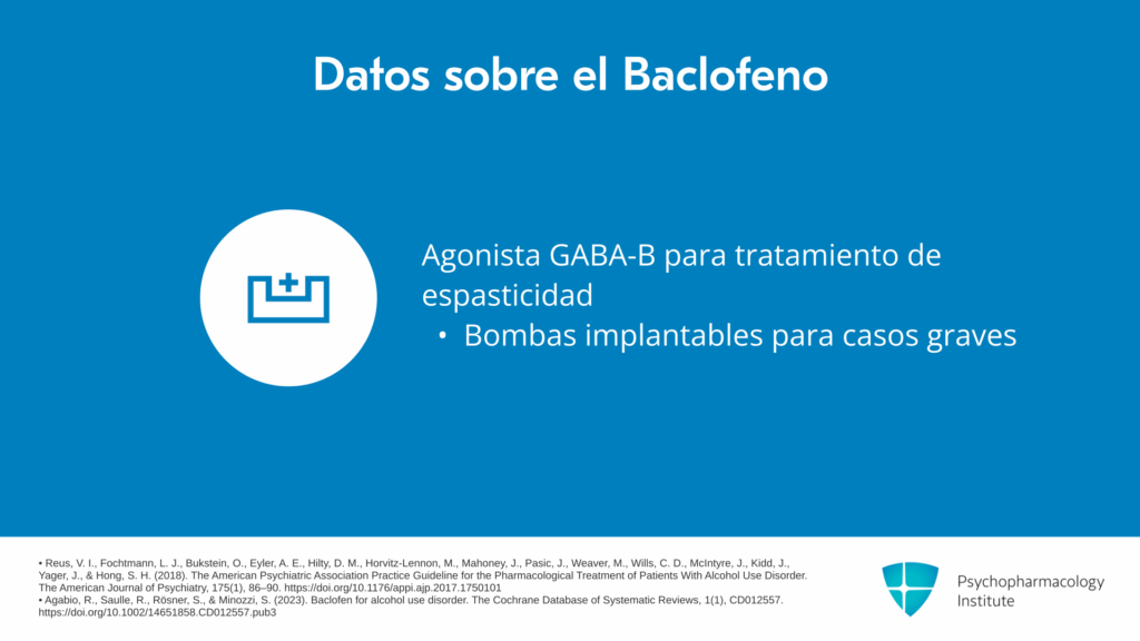 Finalmente, baclofeno. El baclofeno es un agonista GABA-B. Generalmente se usa para el tratamiento del espasmo. Puede ser abusado pero no con frecuencia. Y en dosis muy altas, incluso hay bombas implantables de baclofeno que pueden ser efectivas para aquellos con espasticidad marcada como en esclerosis múltiple, lesión cerebral traumática, etc. Debería reducir la tasa de disparo en las vías de recompensa y reducir los efectos reforzantes del alcohol. Los metaanálisis son bastante variados en cuanto a si el baclofeno logra puntos finales efectivos en el trastorno por consumo de alcohol.